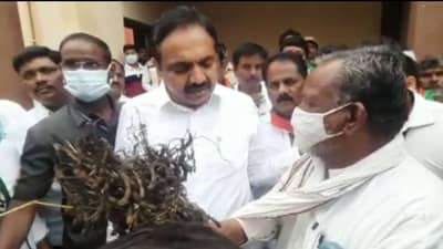 बीड: गेल्या काही दिवसांपासून मराठवाड्यात पावसाने जोरदार हजेरी लावली आहे. त्यामुळे मराठवाड्यातील अनेक भागात पूरस्थिती निर्माण झाली असून शेती वाया गेली आहे. हातातोंडाशी आलेला घास पावसाने हिरावून घेतल्यानंतर हैराण झालेल्या अंबाजोगाई येथील वयस्क शेतकऱ्याने आपल्या लहानग्या नातवासह जलसंपदा मंत्री जयंत पाटील यांची भेट घेतली. एका हातात नातू, दुसऱ्या हातात नुकसानीची मोळी आणि डोळ्यात अश्रू… अशा परिस्थितीत या शेतकऱ्याने जयंत पाटील यांच्याकडे आपली व्यथा मांडली. त्यावेळी जयंत पाटील यांनी या शेतकऱ्याला धीर दिला. घाबरू नका. सरकार तुमच्याबरोबर आहे, असं सांगत जयंत पाटील यांनी या शेतकऱ्याला धीर दिला. (flood affected farmers met jayant patil with damaged crops)