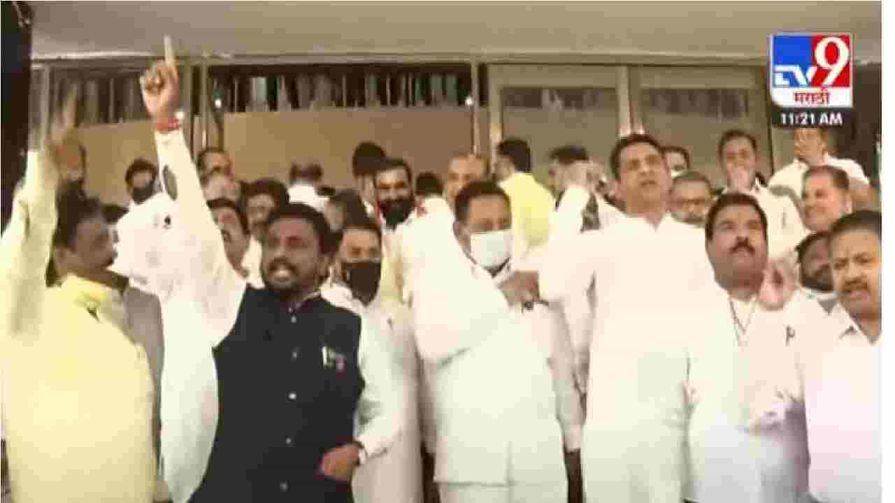 मुंबईः महाराष्ट्राच्या विधीमंडळाचं आज अर्थसंकल्पीय अधिवेशन (Maharashtra Budget Session) आहे. या पार्श्वभूमीवर सत्ताधारी आणि विरोधी पक्ष परस्परांमध्ये भिडले आहेत. एकिकडे अल्पसंख्याक मंत्री नवाब मलिक (Nawab Malik) यांचा राजीनामा घ्या म्हणून भाजप आक्रमक झालेली दिसली. तर सावित्रीबाई फुल्यांचा अपमान करणाऱ्या राज्यपालांचा राजीनामा घ्या, या मागणीसाठी सत्ताधारी आमदारांनी (ShivSena MLA) विधानसभेत रणशिंग फुंकलं. महावाकिसा आघाडीच्या आमदारांनी विधीमंडळाबाहेर एकत्र येत राज्यपाल भगत सिंह कोश्यारी यांचा धिक्कार असो, अशी घोषणाबाजी केली.