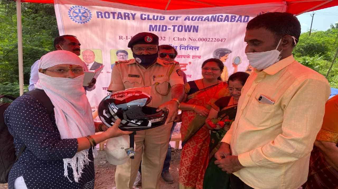 शहरातील महावीर चौक, जकात नाका परिसरात हा उपक्रम घेण्यात आला. रोटरी क्लबच्या अध्यक्ष ज्योती काथार यांच्या संकल्पनेतून आपका भविष्य आपके हाथ, हेल्मेट सदा रहे आप के साथ हा उपक्रम साकारण्यात आला. या दुचाकीवरून हल्मेट न घालता प्रवास करणाऱ्या 50 पेक्षा जास्त पुरुषांना त्यांच्याच पत्नीच्या हस्ते हेल्मेट देण्यात आले. पती-पत्नी हे दोघेही कुटुंबासाठी महत्त्वाचे आहेत. तेव्हा पत्नी जशी कुटुंबाची काळजी घेते, तसेच आपल्या माणसांची काळजी घेण्यासाठी पतीनेही आठवणीने बाहेर पडताना हेल्मेट सोबत नेणे, तितकेच महत्त्वाचे आहे. वाहतुकीच्या नियमांचे पालनही करणे महत्त्वाचे आहे, असे आवाहन या उपक्रमाद्वारे करण्यात आले. क्लबच्या वतीने या वेळी हे हेल्मेट मोफत देण्यात आले. या उपक्रमासाठी रोटरी अध्यक्ष ज्योती काथार यांनी पुढाकार घेतला. कार्यक्रमास पोलिस उपआयुक्त उज्जवला बनकर, वाहतुक शाखेचे सहाय्यक पोलिस आयुक्त सुरेश वानखेडे,सेवानिवृत्त पोलिस उपनिरिक्षक रो.जेम्स अंबिलढगे ,आदी उपस्थित होते.