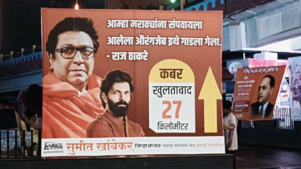 महाराष्ट्रात औरंगजेबाच्या कबरीवरुन सुरू असलेल्या वादाच्या पार्श्वभूमीवर मनसेने छत्रपती संभाजीनगरमध्ये लावलेल्या पोस्टरने सर्वांचे लक्ष वेधले आहे. हे पोस्टर छत्रपती संभाजीनगर पासून ते खुलताबाद पर्यंत संपूर्ण रस्त्यांवर लावण्यात आले आहेत.