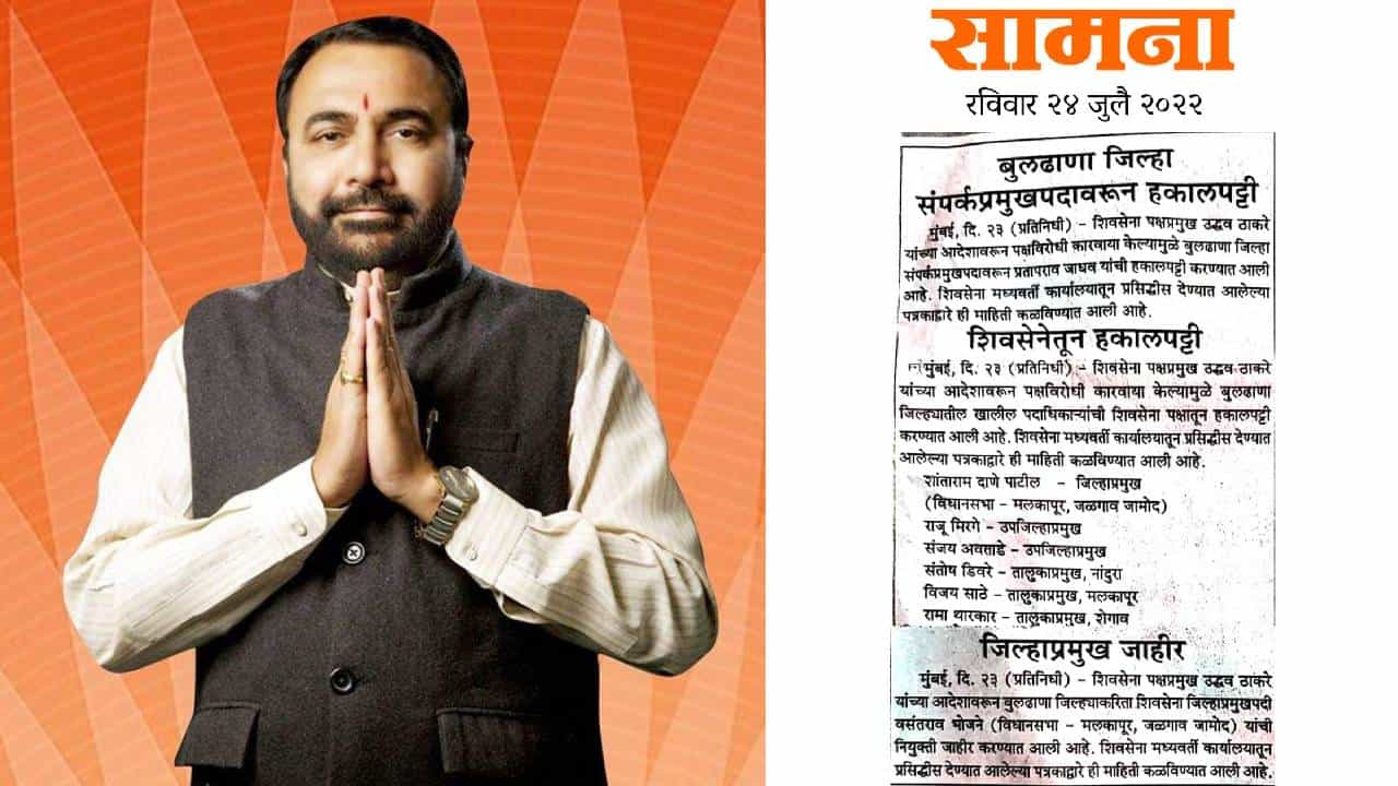 सामना मध्यवर्ती कार्यालयातून प्रसिद्धीस दिलेल्या पत्रकात जिल्हा संपर्क प्रमुख खासदार प्रतापराव जाधव यांना पदावरून कमी करण्यात आले. जिल्हा प्रमुख शांताराम दाणे (मलकापूर जळगाव जामोद, विधानसभा) उपजिल्हा प्रमुख राजू मिरगे, उपजिल्हा प्रमुख संजय अवताडे, तालुका प्रमुख नांदुरा संतोष डिवरे, तालुका प्रमुख मलकापूर विजय साठे, तालुका प्रमुख शेगाव रामा थारकार यांनी पक्षविरोधी कारवाई केली. त्यामुळे शिवसेना पक्षप्रमुख उद्धव ठाकरे यांच्या आदेशाने शिवसेनेतून हकालपट्टी केली. त्यांच्या जागीसुद्धा नियुक्त्या जाहीर केल्या आहेत.