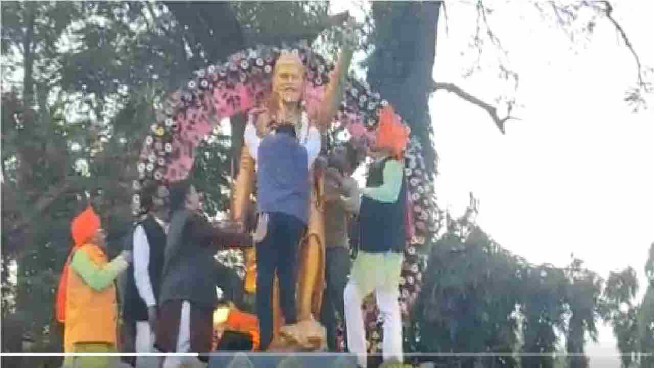 महाआघाडी सरकारमधील मंत्री @VijayWadettiwar यांच्याकडून छत्रपती शिवाजी महाराजांचा अपमान. चंद्रपुर राजूरा येथे पुतळ्यावर हार घालण्यासाठी पुतळ्याचा भागावरच पाय ठेवला…@OfficeofUT काय ॲक्शन घेणार वडेवट्टीवारांवर की सत्तेसाठी दुर्लक्ष करणार? pic.twitter.com/Ire1qbJ798