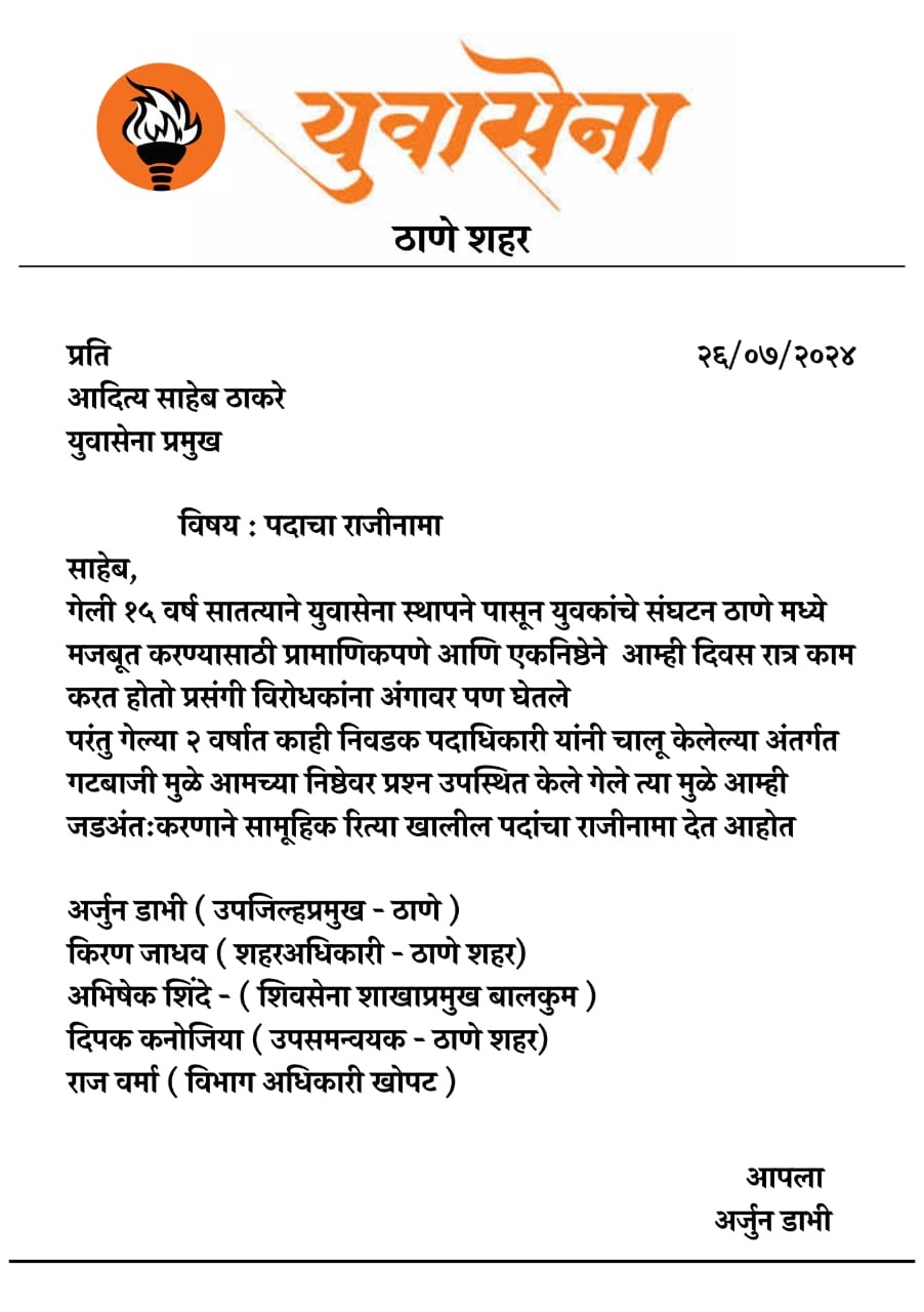 शिवसेनेत ( शिंदे गट) प्रवेश करण्यापूर्वी युवासेना पदाधिकारी यांनी आदित्य ठाकरे यांना एका पत्र पाठविले आहे. या पत्रात त्यांनी ”गेली 15 वर्ष सातत्याने युवासेनेच्या स्थापनेपासून युवकांचे संघटन ठाण्यात मजबूत करण्यासाठी प्रामाणिकपणे आणि एकनिष्ठेने आम्ही दिवसरात्र काम करत होतो. प्रसंगी विरोधकांना अंगावर घेतले. परंतु, गेल्या 2 वर्षात काही निवडक पदाधिकारी यांनी चालू केलेल्या अंतर्गत गटबाजीमुळे आमच्या निष्ठेवर प्रश्न उपस्थित केले गेले. त्यामुळे आम्ही जडअंतकरणाने सामुहिकरित्या पदांचा राजीनामा देत आहे.” असे म्हटले आहे.