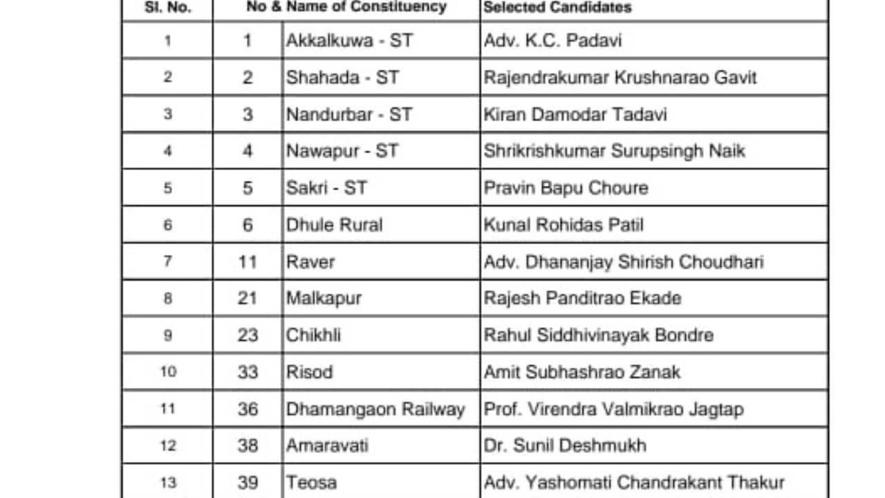 अखेर महाविकास आघाडीच्या जागावाटपाच्या चर्चेनंतर काँग्रेसकडून देखील उमेदवारांची पहिली यादी जाहीर करण्यात आली आहे. काँग्रेसकडून विधानसभा निवडणुकीसाठी एकूण 48 उमेदवारांच्या नावांची घोषणा करण्यात आली आहे. यामध्ये अक्कलकुवातून के. सी. पाडवी, शहादा येथून राजेंद्र गावित, धुळे ग्रामीणमधून कुणाल पाटील, नंदुरबारमधून किरण तडवी, रावेरमधून धनंजय चौधरी, मलकापूरमधून राजेश एकडे, नवापूर येथून शिरीशकुमार नाईक, चिखलीतून राहुल बोंद्रे यांच्या नावांचा समावेश आहे.