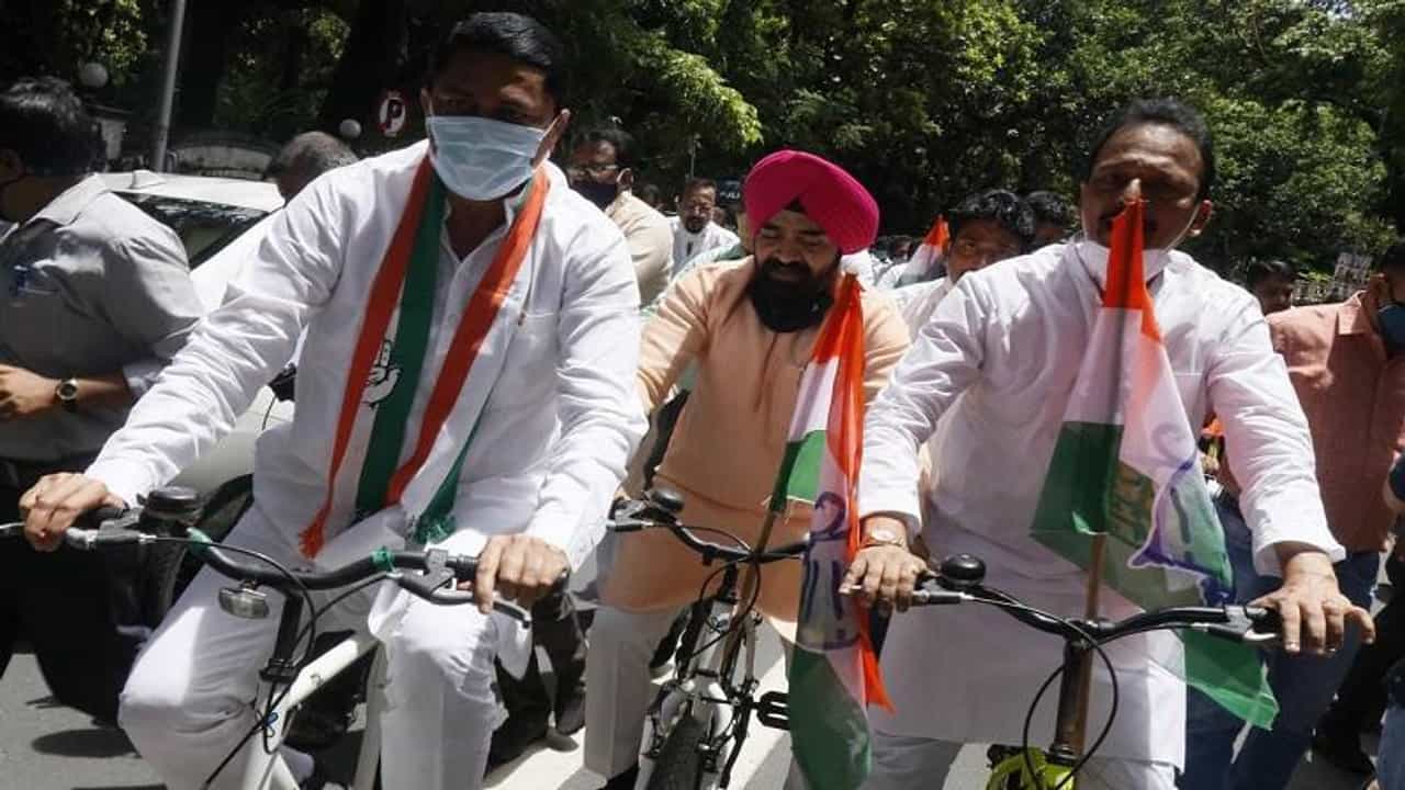सायकलवरून राजभवनात पोहोचले काँग्रेस नेते, मराठा-ओबीसी आरक्षण मुद्द्यावर राज्यपालांना निवेदन