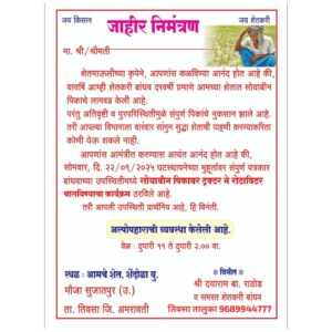 ‘ शेतमाऊलीच्या कृपेने, आपणांस कळविण्यात आनंद होत आहे की, यावर्षी आम्ही शेतकरी बांधवांनी दरवर्षी प्रमाणे आमच्या शेतात सोयाबीन पिकाची लागवड केली आहे. परंतु अतिवृष्टी व पुरपरिस्थितीमुळे संपूर्ण पिकांचे नुकसान झाले आहे. तरी आपल्या विभागाला वारंवार सांगून सुद्धा शेताची पाहणी करण्याकरिता कोणीही येऊ शकले नाही. आपणांस आमंत्रित करण्यास अत्यंत आनंद होत आहे की, सोमवार दि. 22/09/ 2025 रोजी घटस्थापनेच्या मुहूर्तावर संपूर्ण पत्रकार बांधवांच्या उपस्थितीमध्ये सोयाबीन पिकावर ट्रॅक्टर व रोटाव्हेटर फिरवण्याचा कार्यक्रम ठरविला आहे. तरी आपली उपस्थिती प्रार्थनीय आहे, ही विनंती, आल्पोपहाराची व्यवस्था केलेली आहे, स्थळ आमचे शेत, शेंदोळा बु. मैजे सुजातपूर ता. तिवसा जि. अमरावती.’ अशी ही निमंत्रण पत्रिका द्यायाराम राठोड या शेतकऱ्याने छापली आहे. ही निमंत्रण पत्रिका राज्यभरात चर्चेला विषय ठरली आहे.