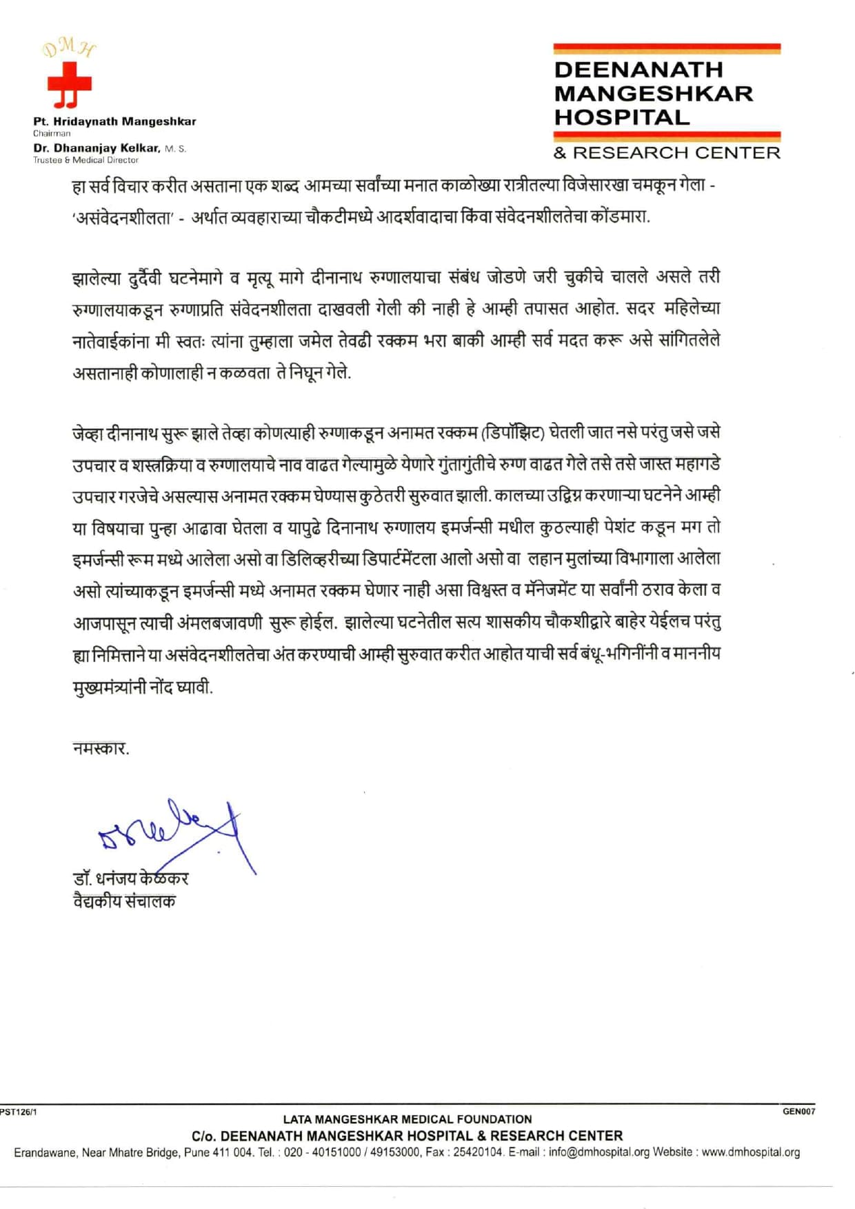 जेव्हा दीनानाथ सुरू झालं तेव्हा कोणत्याही रुग्णाकडून डिपॉझिट घेतलं जात नसे, पण जसजसे उपचार आणि शस्त्रक्रिया व रुग्णालयाचे नाव वाढत गेल्यामुळे येणारे गुंतागुंतीचे रुग्ण वाढत गेले तसतसे जास्त महागडे उपचार गरजेचे असल्यास डिपॉझिट घेण्यास कुठेतरी सुरूवात झाली. कालच्या उद्विग्न करणाऱ्या आम्ही या विषयाचा पुन्हा आढावा घेतला व यापुढे दीनानाथ रुग्णालय इमर्जन्सी मधील कुठल्याही पेशंटकडून मग तो इमर्जन्सी रूममध्ये आलेला असो वा डिलीव्हरीच्या डिपार्टमेंटला आला असेल वा लहान मुलांच्या विभागात असेल त्यांच्याकडून इमर्जन्सी अनात रक्कम ( डिपॉझिट) घेणार नाही, असा विश्वस्त व मॅनेजमेंट या सर्वांनी ठराव केला व आजपासूनच त्याची अंमलबजावणी सुरू होईल, असे रुग्णालयातर्फे जाहीर करण्यात आलं आहे.