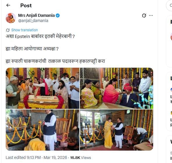 तर आता याच मुद्यावरून सामाजिक कार्यकर्त्या अंजली दमानिया या देखील आक्रमक झाल्या असून त्यांनी रुपाली चाकणकर आणि अशोक खरात यांचे काही नवे फोटो त्यांच्या सोशल मीडिया अकाऊंटवरून शेअर केले आहेत. तसेच त्यांनी यासोबत एक पोस्टही लिहीली आहे. अशा Epstein बाबांवर इतकी मेहेरबानी ? ह्या महिला आयोगाच्या अध्यक्षा ? ह्या रुपाली चाकणकरांची तत्काळ पदावरून हकालपट्टी करा, अशा शब्दांत अंजली दमानिया यांनी हल्ला चढवला आहे.