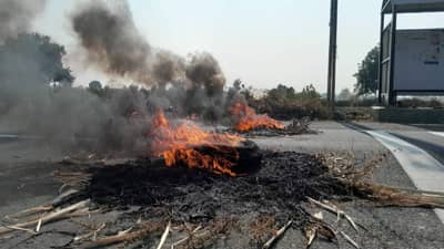 रमेश चेंडके, हिंगोलीः स्वाभिमानी (Swabhimani) शेतकरी संघटनेच्या वतीने सुरु असलेल्या आंदोलनाने चांगलाच पेट घेतला आहे. काल राज्याचे कृषिमंत्री तथा हिंगोलीचे (Hingoli) पालकमंत्री अब्दुल सत्तार (Abdul Sattar) जिल्ह्या दौऱ्यावर आले असताना त्यांच्या ताफ्याला काळे झेंडे दाखले तर आज गोरेगाव जिंतूर ह्या मार्गावर टायर जाळून निदर्शनं करण्यात आली. पिक विमा कंपन्यांच्या मनमानी कारभाराविरोधात हिंगोली जिल्ह्यातील गोरेगाव येथे स्वाभिमानी शेतकरी संघटनेचं आंदोलन सुरु आहे, त्याचे पडसाद मराठवाड्यातही उमटत आहेत.