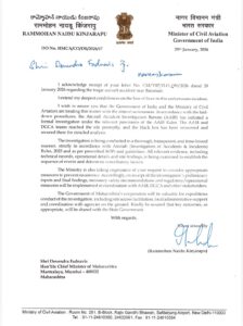 दरम्यान त्यानंतर आता देवेंद्र फडणवीस यांच्या या पत्राला केंद्रीय नागरी उड्डाण मंत्री नायडू यांनी उत्तर दिलं आहे. विमान अपघात तपास ब्युरो (AAIB) यांनी तपास सुरु केला आहे. विमानातील ब्लॅकबॉक्स ताब्यात घेण्यात आला आहेत. विमान अपघात आणि घटनेचा नियमांनुसार तपास सुरू केला आहे. तो पारदर्शी आणि कालबद्ध पद्धतीने होईल. सर्व टेक्निकल रेकॉर्डस, ऑपरेशनल तपशील, घटनास्थळावरील तथ्य याचा तपास केला जात आहे. भविष्यात अशा घटना होऊ नये, या आपल्या विनंतीची मंत्रालयाने दखल घेतली असून, चौकशी अहवाल येताच त्यादृष्टीने उपाययोजना करण्यात येतील. या चौकशीत महाराष्ट्र सरकारचेही सहकार्य आम्हाला मौल्यवान असेल. स्थानिक प्रशासनाची देखील यात मदत लागेल. हा संपूर्ण चौकशी अहवाल राज्य सरकारलाही आम्ही देऊ, असं नायडू यांनी म्हटलं आहे.