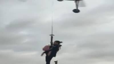 #WATCH | Braving rough seas & strong wind conditions, Indian Coast Guard ship Agrim & helicopter in a jt op rescued 5 crew incl foreigners from a distressed yacht Poorima at Mandwa off Alibaug in the early morning today. Crew safe & shifted to hospital