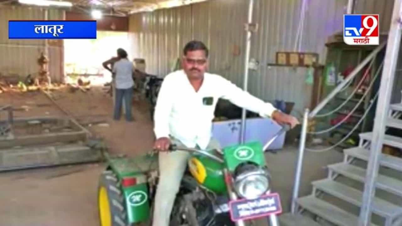 लातूर : आधुनिक यंत्राच्या सहाय्याने शेती समृद्ध करण्याचं अनेक शेतकऱ्यांचं स्वप्न असतं, मात्र हे स्वप्न पैशांअभावी साकार होत नाही. अशा सामान्य शेतकऱ्यांसाठी आता बुलेट ट्रॅक्टरच्या माध्यमातून नवा पर्याय उपलब्ध झाला आहे. लातूर जिल्ह्यातल्या निलंगा येथील मकबूल शेख यांनी अगदी कमी पैशात बुलेट ट्रॅक्टरची निर्मिती केली आहे. हा छोटा बाईक ट्रॅक्टर शेतीच्या मशागतीची सर्व कामे करतो. अगदी दीड टनापर्यंत ट्रॉलीही ओढतो (Innovation of Bullet Tractor in affordable price by Makbul Shaikh in Latur)!