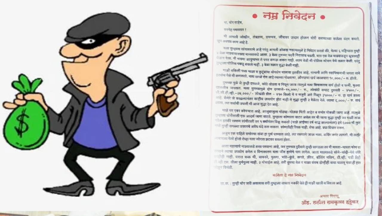 माननीय चोर साहेब, सस्नेह नमस्कार ! मी आपली जोखीम, तंत्रज्ञान, समन्वय, जीवावर ऊदार होऊन चोरी करण्याच्या कलेला वंदन करतो. खूप अवघड काम आहे हे. आपली ओळख नसल्यामुळे हे निवेदन करतो की, गेल्या 6 महिन्यांत तुम्ही 5 वेळा माझ्यासारख्या मानसाकडे आले. 3 वेळा तुमच्या पदरी निराशाच पडली. मात्र एक वेळ माझ्याकडून खूप काही घेऊन गेले. मी माझ्या आयुष्यभर ते परत कमऊ शकत नाही. त्याच वेळी मी पोलीस स्टेशनमध्ये तक्रार केली. परंतु तुम्हाला पोलीस पकड़ू शकले नाही. 3 वेळा तक्रारसुद्धा केली नाही, अशी खंत त्यांनी चोराला उद्देशून लिहिलेल्या पत्रात केली आहे.
