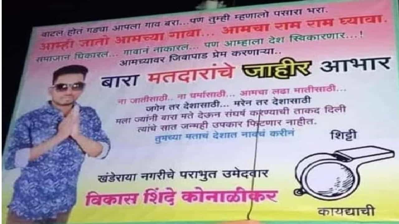 लातूर जिल्ह्यातल्या डोंगर-कोनाळीतील ग्रामपंचायत निवडणुकीत विकास शिंदे कोनाळीकर रिंगणात उतरला होता. विकास एकटाच वॉर्डात अपक्ष उभा होता. त्याचं निवडणूक चिन्ह होतं शिट्टी. निवडणुकीत विकासला केवळ बारा मतं मिळाली. मात्र या 12 मतांची किंमत त्याच्या नजरेत बाराशे मतांइतकी आहे. म्हणूनच मतदारांचे आभार मानण्यासाठी त्याने बॅनर लावला.