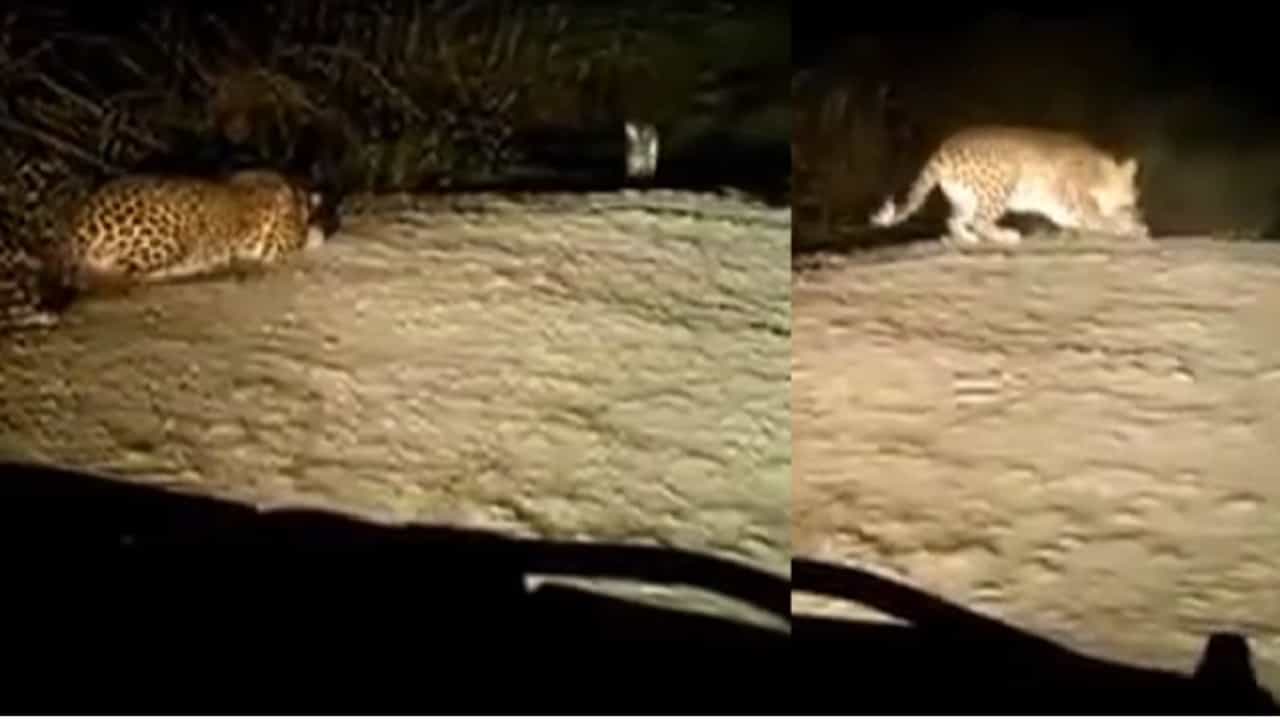 मनमाड-चांदवड रोडवर रात्रीच्या वेळी भूकलेला बिबट्या सशाची शिकार करताना दिसून आला. रोडवरुन बिबट्या चालत असताना समोर त्याला ससा दिसला. सावज टप्प्यात येताच त्याने झडप घातली अन् सशाची शिकार करण्याचा प्रयत्न केला. पण चपळ सशाने अलगदपणे बिबट्याच्या तोंडातून उडी मारली आणि धूम ठोकली.