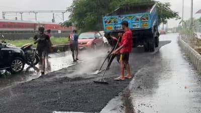 नालासोपारा | मुंबई नजीकच्या नालासोपाऱ्यातून अजब प्रकार समोर आला आहे. नालासोपाऱ्यात भर पावसात रस्त्याचे डांबरीकरण करण्याचा अजब प्रकार समोर आलाय. नालासोपारा पूवेर्तील कॅपिटल मॉल समोरील रस्त्यावर डांबरीकरण करण्यात आलं. वसई विरारमध्ये अवघ्या महिनाभरातच रस्त्याची दुरावस्था होत आहे. काही दिवसापूर्वी भरलेले खड्डे पुन्हा उखडत आहे. त्यामुळे पालिकेची कामे निकृष्ट दर्जाची होत असून, नागरीकांच्या कररुपी पैशाचा चुराडा सुरु असल्याच आरोप होत आहे.
