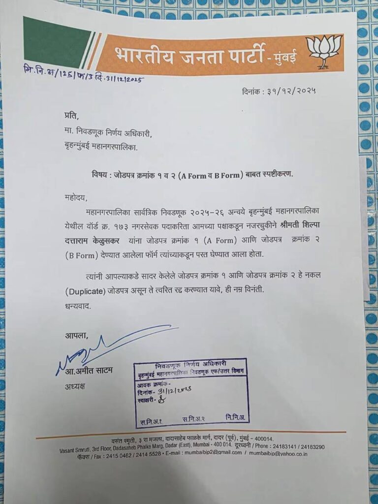 महानगरपालिका निवडणुकीसाठी इच्छुक असूनही पक्षाकडून तिकीट न मिळाल्याने भारतीय जनता पक्षाच्या उमेदवाराने चक्क डुप्लीकेट एबी फॉर्म जोडून अर्ज केल्याचा अत्यंत धक्कादायक प्रकार उघडकीस आला आहे. वॉर्ड क्रमांत 173 मधून शिल्पा केळुसकर यांनी चक्क कलर झेरॉक्स काढली आणि फॉर्मची ती ड्युप्लीकेट कॉपी त्यांच्या अर्जासोबत जोडून तो अर्ज सादर केला. ही धक्कादायक घटना उघडकीस येताच एकच खळबळ माजली. मात्र मुंबई भाजपचे अध्यक्ष अमित साटम यांनी याप्रकरणी तातडीने पावलं उचलत निवडणूक आयोगात तक्रार दाखल केली. उमेदवाराने डुप्लीकेट फॉर्म जोडल्याचे नमूद करत त्यांनी हा एबी फॉर्म रद्द करण्याचीही मागणी केली.