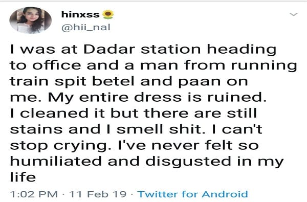 बोरीवली येथे राहणारी हिनल शाह (20) ही तरुणी कुर्ला येथील एका जाहिरात एजन्सीमध्ये इंटर्नशिप करत आहे. सोमवारी सकाळी ती बोरीवलीहून निघाली आणि दादर स्टेशनला उतरली यावेळी ती प्लॅटफॉर्म क्रमांक 4 वर उभी असताना तिथून वेगाने जाणाऱ्या लोकलमधून एका अज्ञात व्यक्ती तिच्या अंगावर थुंकला. या किळसवाण्या प्रकराने तिला भयंकर राग आला होता. मात्र त्यावेळी कपड्यांवर असलेली घाण लपवणे गरजेचे होते.