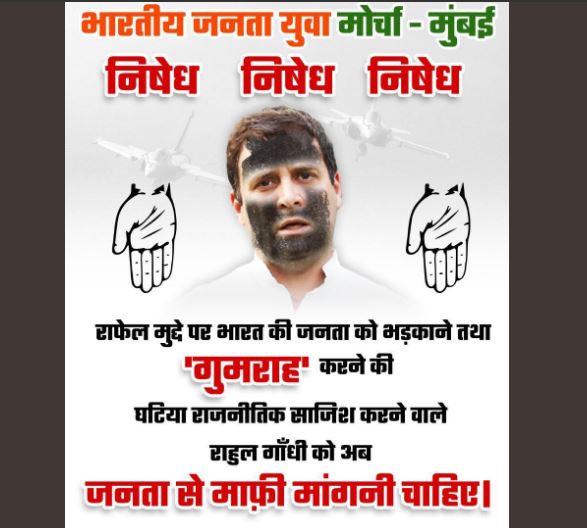 मुंबई: मोदी आणि फडणवीस सरकारच्या काळात ऐतिहासिक घटना घडत आहेत. शेतकरी संप असो वा अन्य कोणतीही आंदोलने या सरकारने पाहिली. त्यातच आता सत्ताधारी भाजपने प्रमुख विरोधी पक्ष असलेल्या काँग्रेसच्या कार्यालयावर मोर्चा काढण्याचा पराक्रम केला. “राफेल खरेदी व्यवहारप्रकरणी काँग्रेस अध्यक्ष राहुल गांधी खोटे दावे करत आहेत. तसंच ते देशाचा आणि पंतप्रधान मोदींचा अपमान करत आहेत”, असा आरोप करत भाजपने काँग्रेस कार्यालयावर आज मोर्चा काढला. तसंच राहुल गांधी यांच्या फोटोला काळं फासलं.