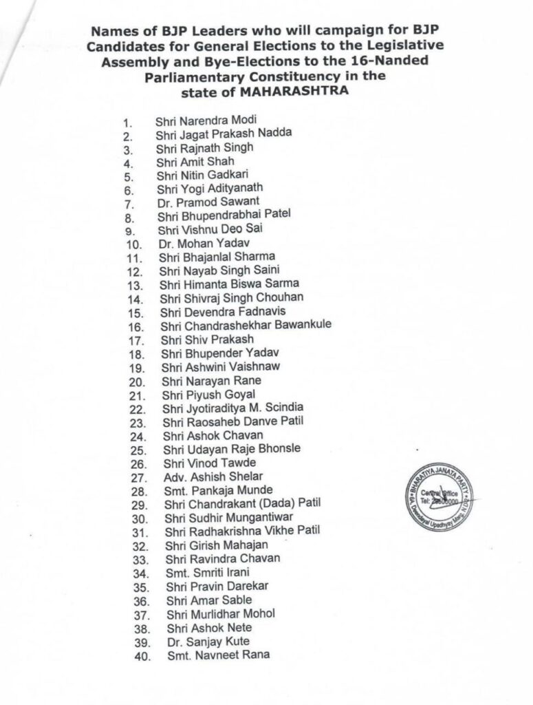 BJP Star Campaigners : राज्यात विधानसभा निवडणूक एकाच टप्प्यात होणार आहे. ऐन दिवाळीत आता एकमेकांविरोधात फटाके फुटणार आहे. भाजपने त्यांच्या स्टार प्रचारकांची यादी जाहीर केली आहे. त्यात पंतप्रधान नरेंद्र मोदी यांच्यासह 40 जणांचा समावेश आहे. पण या यादीत देशाच्या लाडक्या कवीचे नाव काही दिसत नाही.