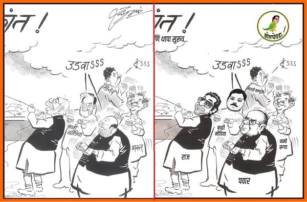 मुंबई : मनसे अध्यक्ष राज ठाकरे यांनी ‘सक्रांत’ स्पेशल व्यंगचित्र काढून पुन्हा एकदा पंतप्रधान नरेंद्र मोदी आणि भाजपचे राष्ट्रीय अध्यक्ष अमित शाह यांच्यावर आपल्या कुंचल्यातून फटकारे ओढले आहेत. राज ठाकरेंनी काढलेले हे व्यंगचित्र भाजपच्या इतक्या जिव्हारी लागलं की, त्यांनी लगेच प्रत्युत्तरासाठी दुसरे व्यंगचित्र प्रसिद्ध केले. मात्र, भाजपने राज ठाकरेंनी रेखाटलेले व्यंगचित्रच वापरले असून, केवळ त्यातील […]