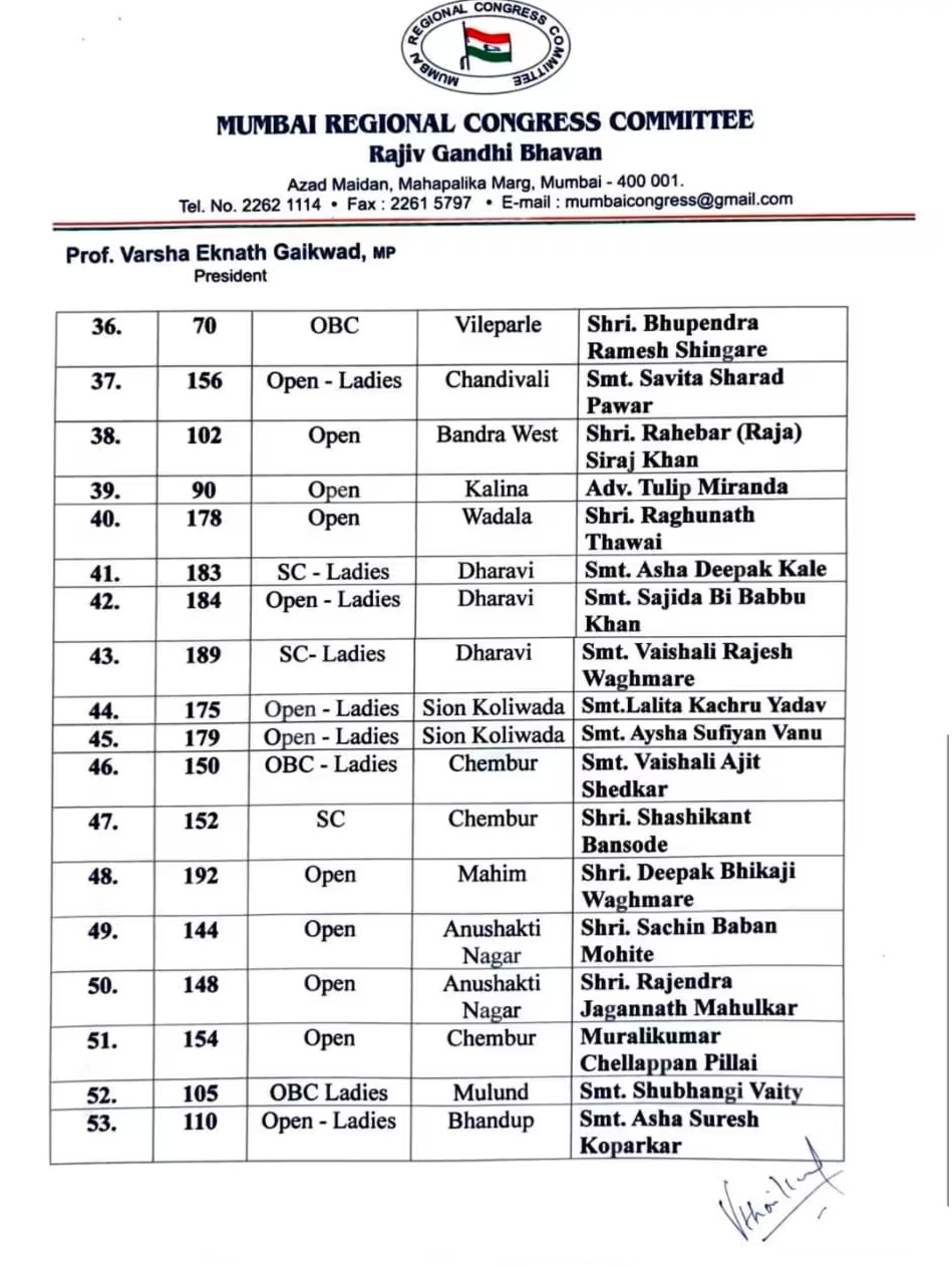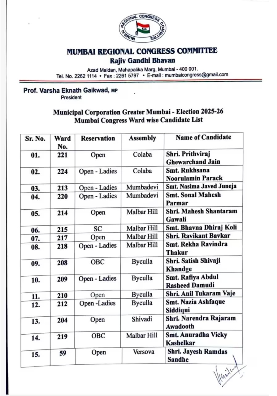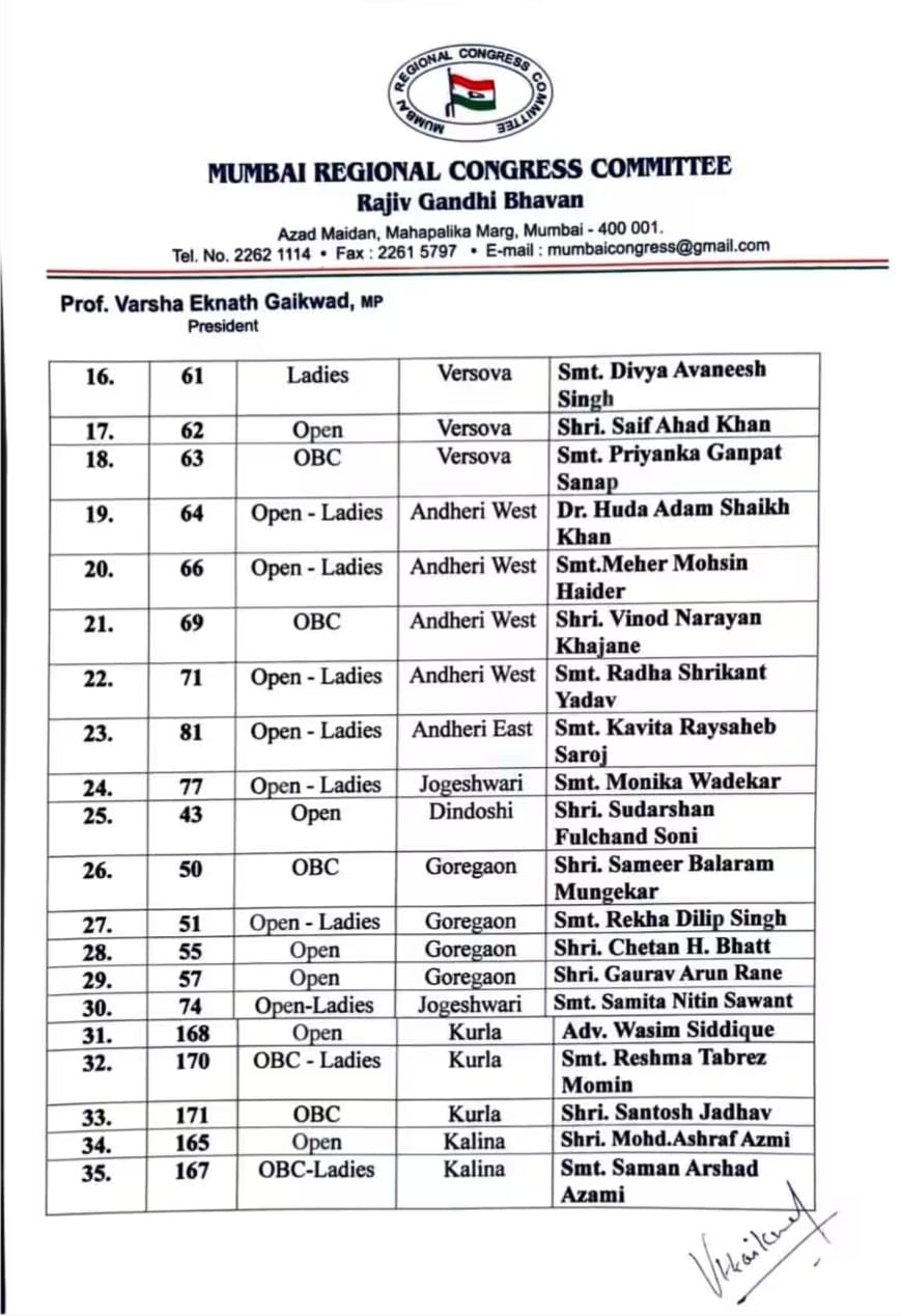 मुंबईत काँग्रेसने अखेर आपली उमेदवारांची पहिली यादी जाहीर केली आहे. काँग्रेसने मुंबई महानगर पालिका निवडणूकांसाठी वंचित सोबत आघाडी केली आहे. या आघाडीमुळे काँग्रेसच्या नेत्या वर्षा गायकवाड नाराज असल्याचे सांगण्यात येते.