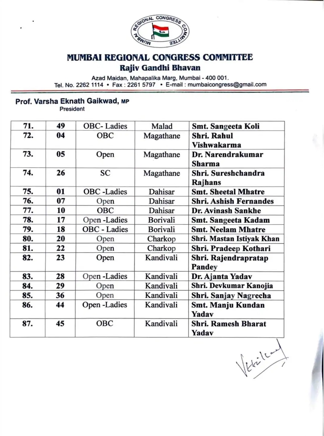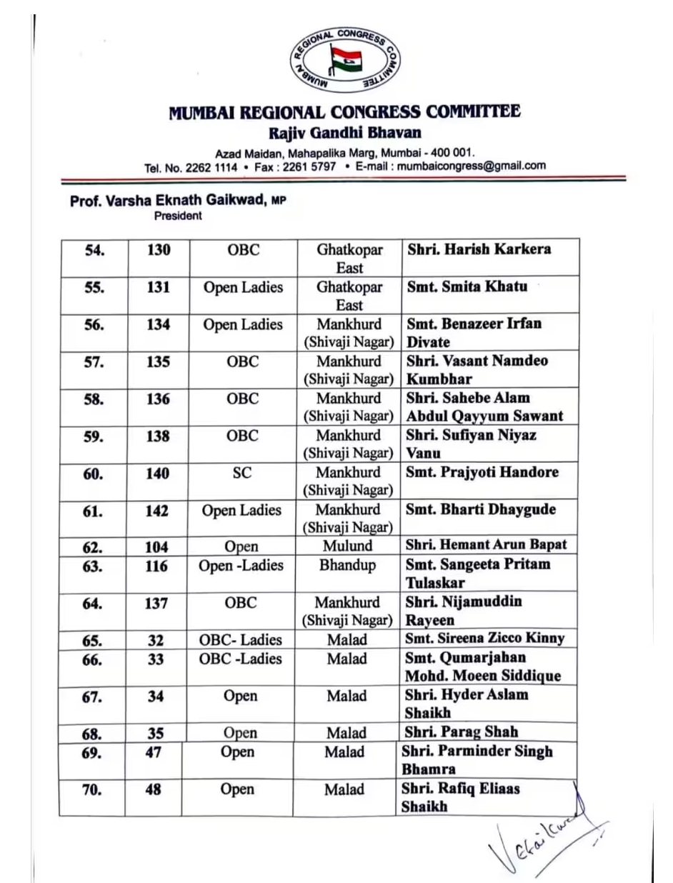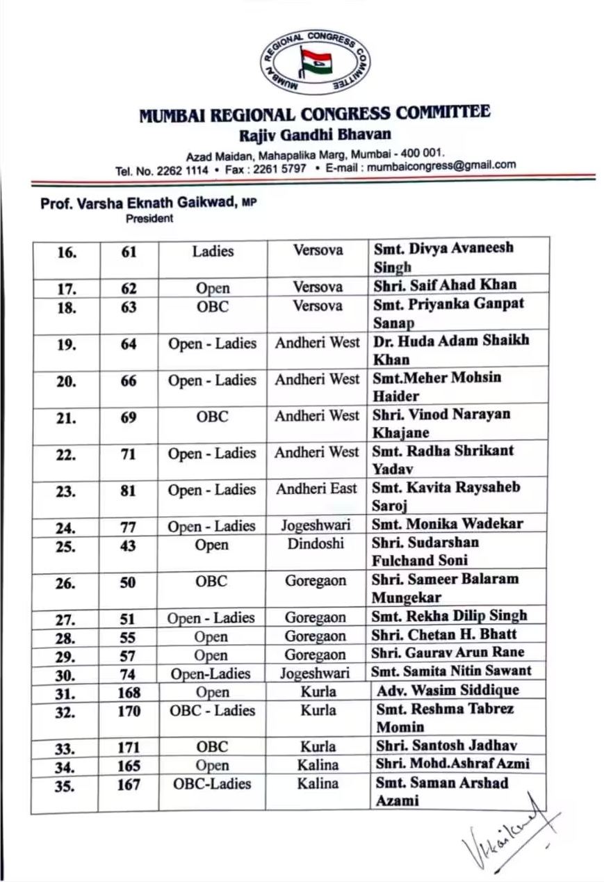 मुंबई महानगर पालिकेच्या निवडणूकीची पहिली यादी काँग्रेसने जाहीर केली आहे. मुंबई महानगर पालिकेत काँग्रेसने आधी स्वबळाचा नारा दिला होता. मात्र कालच काँग्रेसेने वंचित सोबत आघाडी केल्याने आता काँग्रेसने पहिली यादी जाहीर केलेली आहे. काँग्रेसच्या पहिल्या यादीत एकूण 87 उमेदवाराची नावे जाहीर करण्यात आली आहेत. या यादीत काँग्रेसने कोणा-कोणाला उमेदवारी जाहीर केली आहे आणि कोणाला तिकीट दिले आहे हे वाचूयात.