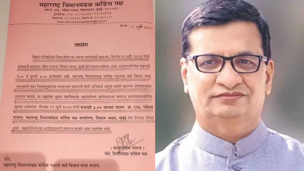 “विधान परिषदेच्या रिक्त होणाऱ्या अकरा जागांसाठी शुक्रवार, दिनांक १२ जुलै, २०२४ रोजी मध्यवर्ती सभागृह, चौथा मजला, विधान भवन, मुंबई येथे मतदान होणार आहे, मतदानाची वेळ सकाळी ९.०० ते दुपारी ४.०० वाजेपर्यंत आहे. महाराष्ट्र विधानमंडळ काँग्रेस पक्षाच्या सर्व विधान सभा सदरयांनी सदर निवडणुकांच्या मतदानात सहभागी होणे अनिवार्य असून त्यांनी पक्षाच्या आदेशानुसार मतदान करावे. या पक्षादेश नुसार महाविकास आघाडीच्या उमेदवाराला मतदान करण्यासंदर्भातील सूचना आपणांस दिनांक १२ जुलै २०२४ रोजी सकाळी ८.०० वाजता दालन क्र. १२६, पहिला मजला, महाराष्ट्र विधानमंडळ काँग्रेस पक्ष कार्यालय, विधान भवन, मुंबई येथे देण्यात येणार आहे. पक्षाने दिलेल्या आदेशाप्रमाणे मतदान करावे असा पक्षादेश आहे”, असं काँग्रेसच्या व्हीपमध्ये म्हटलं आहे.