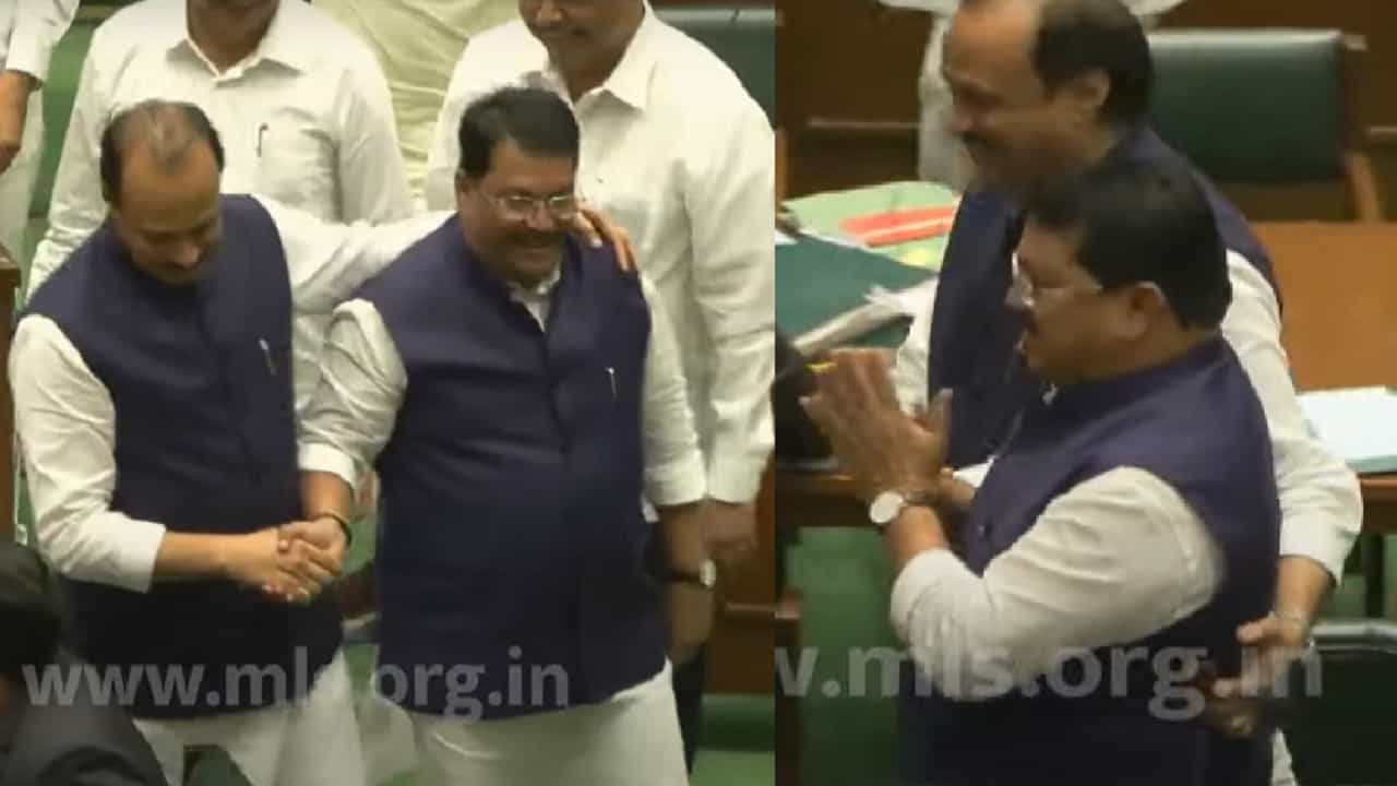 मुख्यमंत्री एकनाथ शिंदे, उपमुख्यमंत्री देवेंद्र फडणवीस यांनी विजय वडेट्टीवार यांच्याशी हस्तांदोलन केले. तर अजित पवार यांनी वडेट्टीवार यांच्या खांद्यावर हात ठेवत त्यांना आपल्या बाजूला ओढले. त्याचवेळी मंत्री गुलाबराब पाटील पाठीमागून धावत आले आणि त्यांनी वडेट्टीवार यांच्याशी हात मिळविण्याचा प्रयत्न केला. मात्र, अजित पवार यांनी दुर्लक्ष करत वडेट्टीवार यांना सत्ताधारी पक्षाच्या बाकाजवळ नेले.