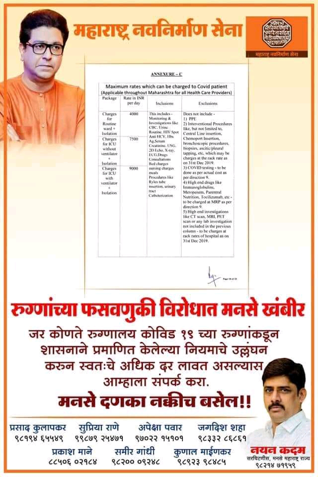 “रुग्णांच्या फसवणुकीविरोधात मनसे खंबीर आहे. जर कोणतेही रुग्णालय कोविड 19 च्या रुग्णांकडून शासनाने प्रमाणित केलेल्या नियमाचे उल्लंघन करुन स्वत:चे अधिक दर लावत असल्यास आम्हाला संपर्क करा, मनसे दणका नक्कीच बसेल,” अशा आशयाचे बॅनर मनसेने लावले आहेत. यात मनसेच्या अनेक पदाधिकाऱ्यांचे फोन नंबरही देण्यात आले आहेत.