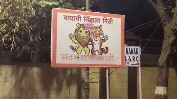 ‘वाघाची सिंहाला मिठी सत्ताकारणासाठी’ असे वाक्य आणि त्यावर वाघ आणि सिंहाचे चित्र असलेले पोस्टर शिवसेना पक्षप्रमुख उद्धव ठाकरे यांच्या वांद्रे येथील ‘मातोश्री’ या निवासस्थानी लावण्यात आले आहे. हे पोस्टर ‘मातोश्री’समोरुन येणाऱ्या-जाणाऱ्यांचे लक्ष वेधून घेत आहे.