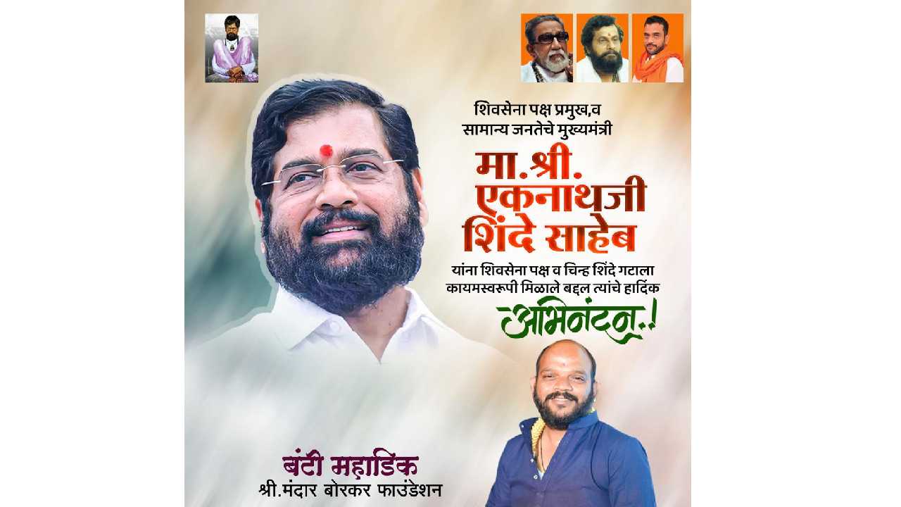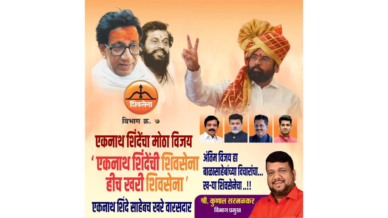 एकनाथ शिंदे यांचा मोठा विजय… ‘एकनाथ शिंदे यांची शिवसेना हीच खरी शिवसेना’ एकनाथ शिंदे साहेब हेच खरे वारसदार. अंतिम विजय हा बाळासाहेबांच्या विचारांचा… खऱ्या शिवसेनेचा…!, असा या बॅनरवर मजकूर आहे. हा बॅनर कुणाल सरमळकर यांनी लावला आहे.