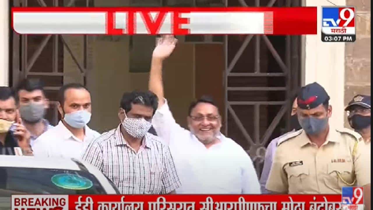 मुंबई : आज पाहटेपासून राष्ट्रवादीचे नेते आणि अल्पसंख्याक मंत्र नवाब मलिक (Nawab Malik) यांची चौकशी सुरू होती. त्यांना दुपारी ईडीने (ED) अटक केली. यावेळी दोन्ही बाजुने जारदार राजकीय वार-पलटवार सुरू असताना, ही अटक झाल्याने वातावरण आणखीच तापलं आहे. नवाब मलिक यांना त्यानंतर मेडिकला रुग्णालयात नेण्यात आलं. मात्र मलिकांना माध्यमांना प्रतिक्रिया देण्यास ईडीने मनाई केली होती. तरीही ईडीच्या ताब्यातून झुकेंगे नहीं, लढेंगे और जितेंगे अशी घोषणा नवाब मलिक (Nawab Malik Arrest) यांनी केली आहे. यावेळी जेजे रुग्णालय परिसरात जिथे मलिकांचे मिडीकल करण्यासाठी नेण्यात आलं तिथेही मोठा पोलीस बंदोबस्त लावण्यात आल्याचे दिसून आले. ही कारवाई सुडाच्या भावनेतून होत असल्याची खरपूस टीका भाजपकडून करण्यात येत आहे. तर तसे वाटत असेल तर कोर्टात जा, असे भाजप नेते बजावत आहेत.