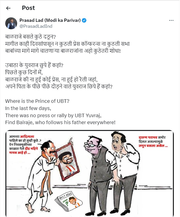 हे व्यंगचित्र ट्विट करत असताना प्रसाद लाड यांनी कॅप्शनमधूनही आदित्य ठाकरेंवर निशाणा साधलाय. “बाळराजे बसले कुठे दडून? मागील काही दिवसांपासून न कुठली प्रेस कॉन्फरन्स ना कुठली सभा. बाबांच्या मागे मागे चालणाऱ्या बाळराजांना अहो कुठेतरी शोधा”, असा खोचक टोला प्रसाद लाड यांनी दिला आहे. त्यांच्या या व्यंगचित्रावर आता ठाकरे गटाकडून काय प्रत्युत्तर देण्यात येतं ते पाहणं महत्त्वाचं ठरणार आहे.