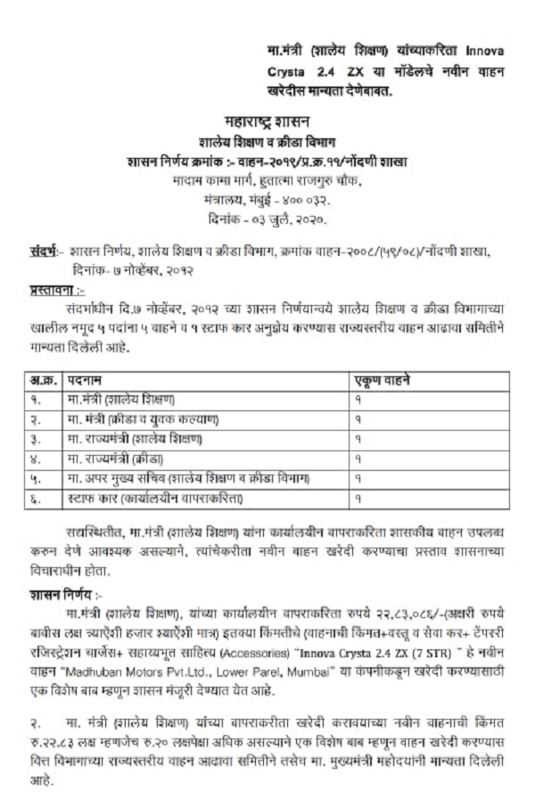राज्य सरकारच्या वाहन आढावा समितीने विशेष बाब म्हणून या वाहन खरेदीसाठी परवानगी दिली आहे. विशेष म्हणजे या समितीसमोर शालेय शिक्षण मंत्री वर्षा गायकवाड, राज्यमंत्री बच्चू कडू, क्रीडा व युवक कल्याण मंत्री सुनील केदार, क्रीडा राज्यमंत्री अदिती तटकरे, शिक्षण अपर सचिव आणि कार्यालयीन वापरासाठी एक अशा एकूण 6 गाड्या खरेदीचे प्रस्ताव विचाराधीन होते. यापैकी शालेय शिक्षणमंत्र्यांच्या वाहन खरेदीला मंजुरी मिळाली आहे. या इनोव्हा गाडीची किंमत (जीएसटी आणि इतर मिळून) 22 लाख 83 हजार रुपये आहे.