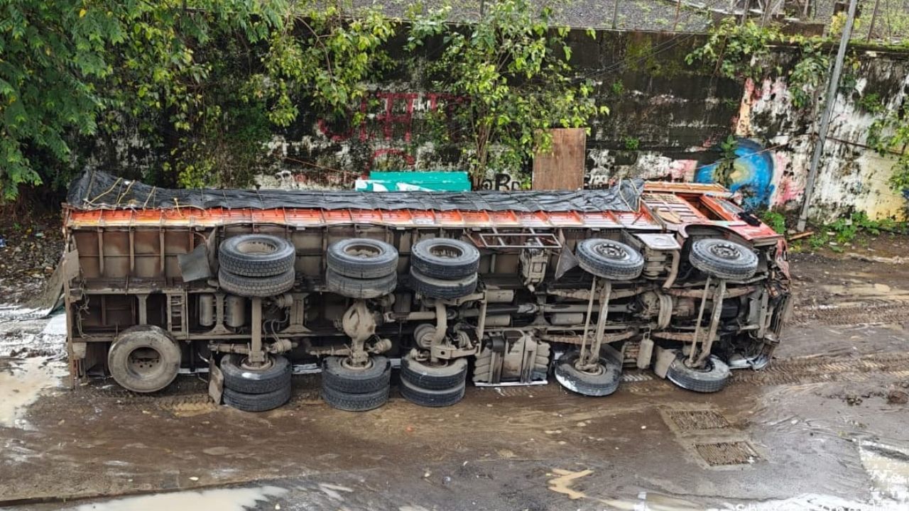 ठाण्यात कंटेनर पलटी झाला.