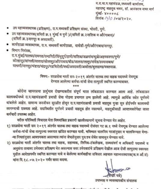 - सरळसेवा 2019 मध्ये भरती झालेले चालक-वाहक यांची सेवा तात्पुरती खंडित करावी.