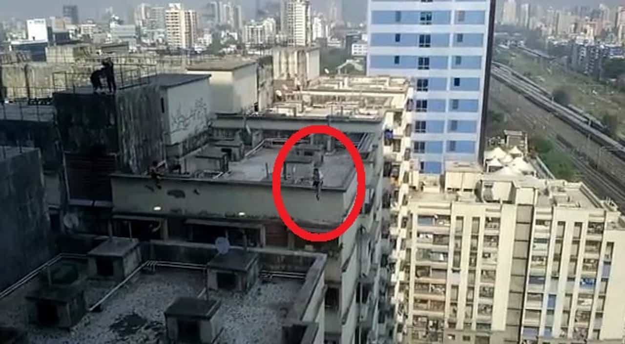इमारतीच्या छतावर काही मुलं दिसत आहेत. इथे एक मुलगा उभा आहे, त्याच टेरिसवर आणखी दोन मुलं एका कडेला बसलेले आहेत. एक मुलगा, जो दुसऱ्या इमारतीवरून कदाचित व्हिडिओ शूट करतोय. जो मुलगा इमारतीवर उभा आहे, तो पळत येतो आणि उडी मारतो.
