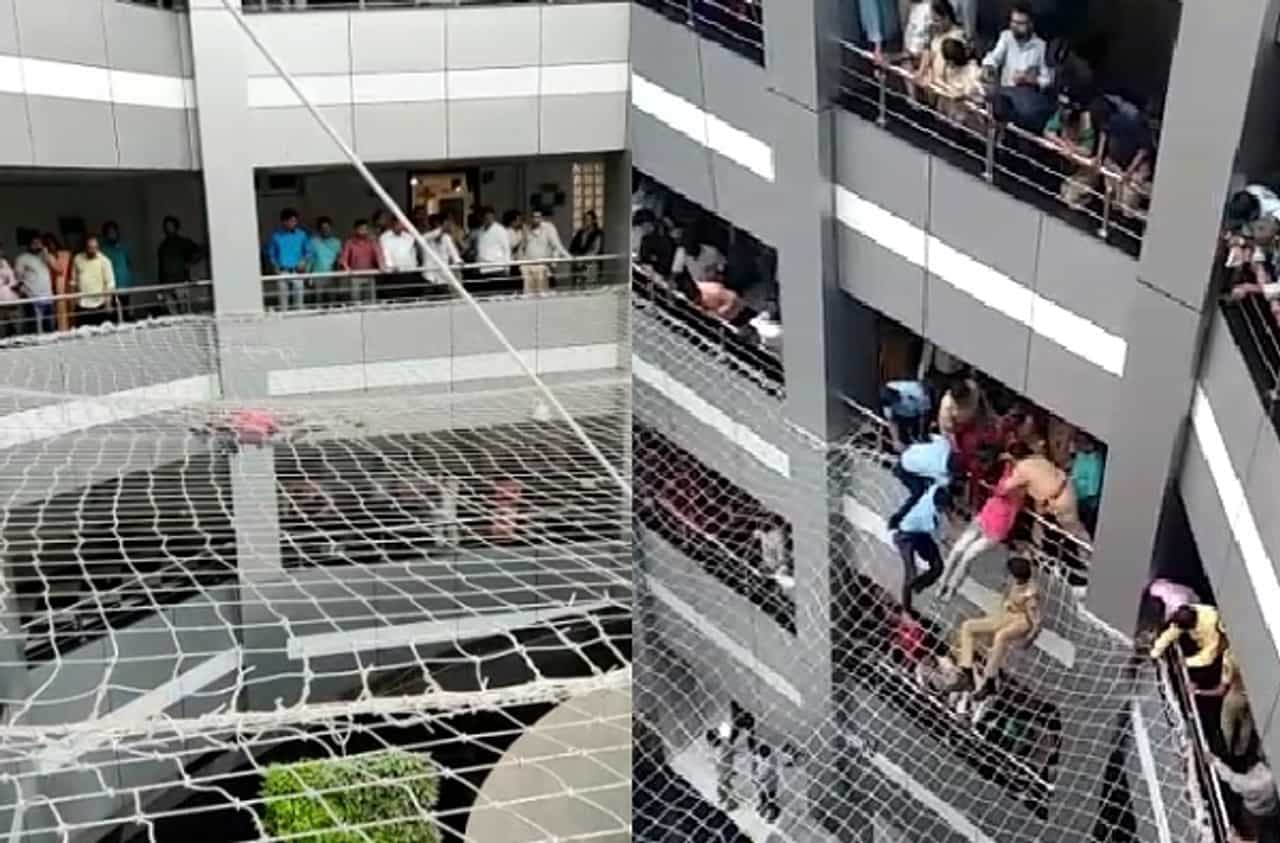 आपल्या मागण्यांची विविध पत्रकं लक्ष्मण चव्हाण यांनी वरच्या मजल्यावरुन खाली भिरकावली. त्यानंतर त्यांनी स्वत: खाली उडी मारुन जीव देण्याचा प्रयत्न केला. मात्र ते सुरक्षेला लावलेल्या जाळीत अडकले.