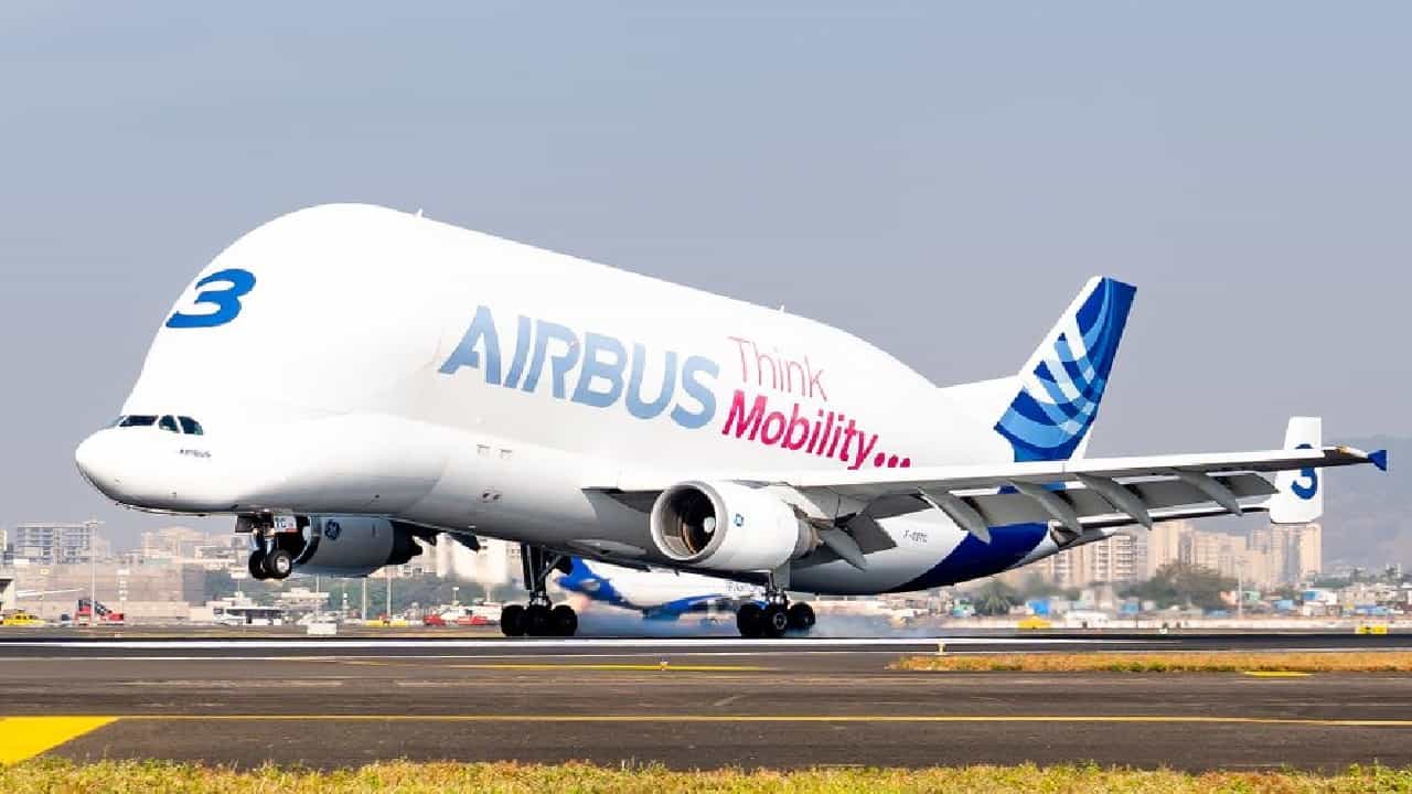 सुनिल काळे, मुंबईः जगातलं सर्वात मोठं विमान (World’s Big Airoplane) कसं दिसतं, त्याची नेमकी वैशिष्ट्य काय आहेत, हे पाहण्याची संधी भारतीयांना मिळाली. मुंबईच्या छत्रपती शिवाजी महाराज आंतरराष्ट्रीय विमानतळावर मंगळवारी संध्याकाळी उतरले. ‘एअरबस बेलुगा’ (Airbus Bulega) असं विमानाचं नाव आहे. विमानाचे डिझाइन व्हेल माशासारखे (Whale Fish) आहे. मात्र हे प्रवासी विमान नसून मालवाहू विमान आहे. 51 टन मालवाहू क्षमतेचं आहे. या विमानाची दृश्य आणि फोटो नुकतेच व्हायरल झाले असून सोशल मीडियावर ते वेगाने शेअर केले जात आहेत.