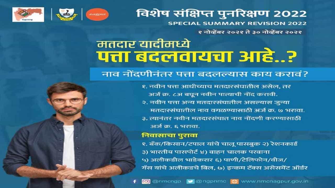 नागपूर : महाराष्ट्र मुख्य निवडणूक अधिकारी कार्यालयाच्यावतीने विशेष संक्षिप्त पुनरीक्षण कार्यक्रमाला सुरुवात झाली आहे. या अंतर्गत मतदार नोंदणी मोहीम राबविण्यात येत आहे. नागपूर शहरातील १८ वर्षे पूर्ण झालेल्या प्रत्येक व्यक्तीसह दिव्यांग, तृतीयपंथी, बेघरांचे नावही मतदार यादीमध्ये समाविष्ठ करण्यात येत आहे.