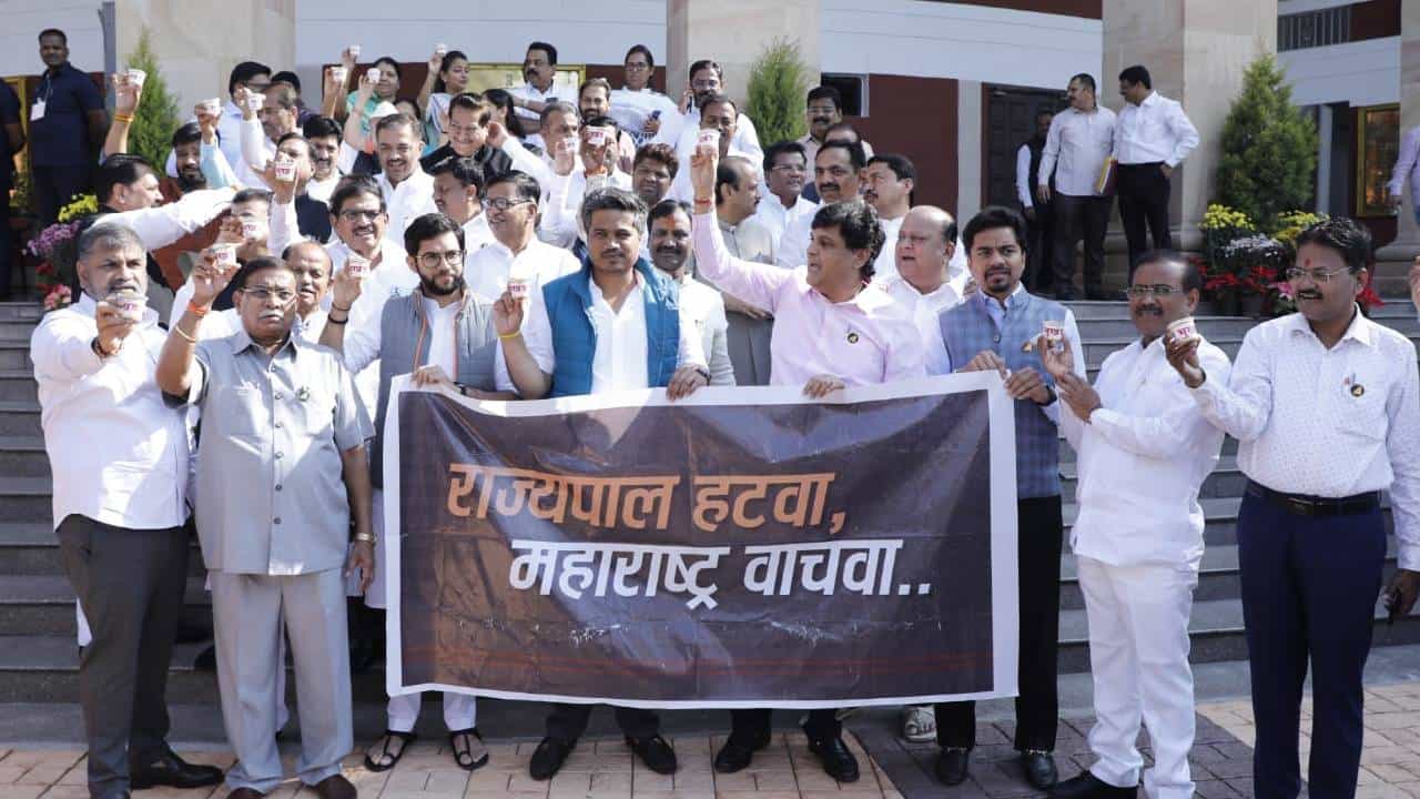 मुख्यमंत्री एकनाथ शिंदे यांच्यावर काल विरोधकांनी भूखंडावरून आरोप केला होता. त्याचे आजही पडसाद उमटले. विरोधकांनी विधानसभेच्या पायरीवर उभं राहून राज्य सरकारच्या विरोधात जोरदार घोषणाबाजी केली. मुख्यमंत्री एकनाथ शिंदे यांनी या प्रकरणी राजीनामा देण्याची मागणीही त्यांनी केली. तसेच राज्यपाल भगतसिंह कोश्यारी यांच्या राजीनाम्याची मागणीही करण्यात आली. यावेळी राज्यपाल हटवा, महाराष्ट्र वाचवा, असं लिहिलेला बॅनर्स विरोधकांच्या हातात होता.