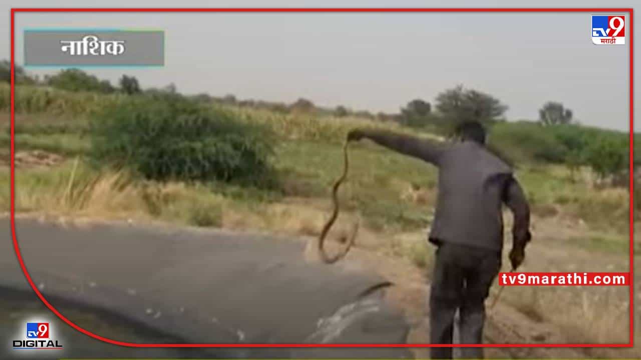 नाशिकच्या एका शेतकऱ्याने या नागाला जीवदान दिलंय. येवला तालुक्यातील एरंडगावातील ही घटना आहे.विजय कुमार दुकळे या शेतकऱ्याच्या शेततळ्यात नाग नागिनीची जोडी आढळून आली. विजय कुमार दुकळे यांनी त्वरित सर्पमित्राला फोन केला. सर्पमित्र घटनास्थळी दाखल झाला. त्यांनी लगेच परिस्थितीचं गांभिर्य लक्षात घेत या नाग आणि नागिनीच्या जोडीला जीवदान दिलं.
