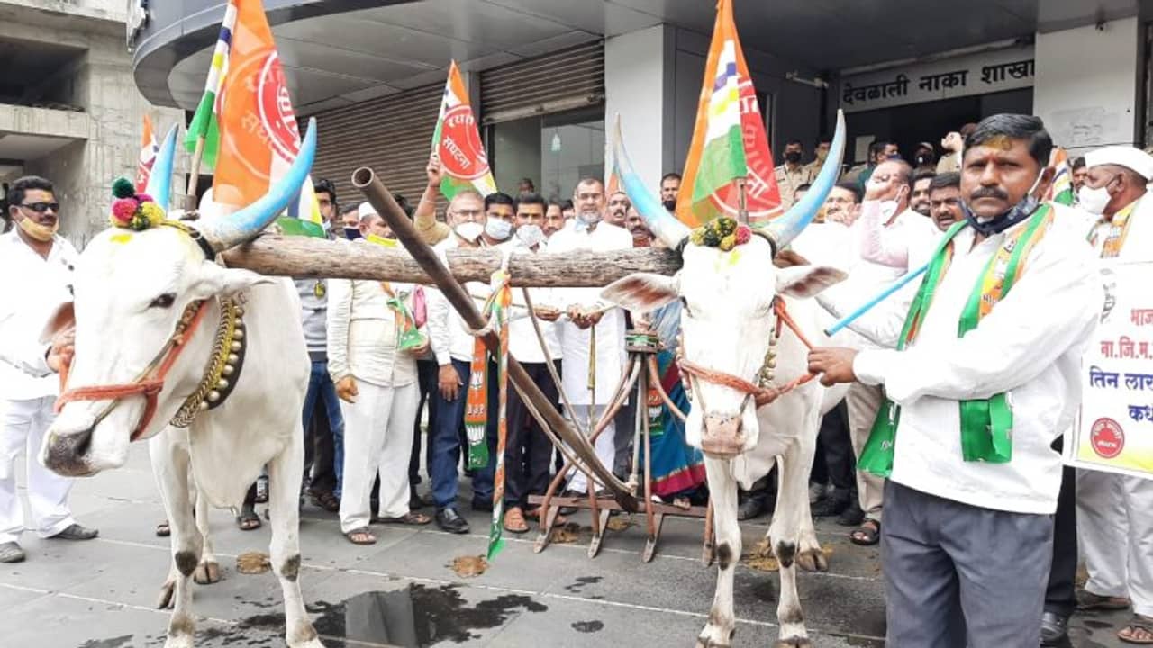 शेतकऱ्यांना चालू खरीप हंगामासाठी पीक कर्ज उपलब्ध करून द्यावे, या मागणीसाठी रयत क्रांती संघटनेच्या माध्यमातून नाशिक जिल्हा मध्यवर्ती बँकेच्या समोर बैल आणि नांगर घेऊन निदर्शने करण्यात आली.
