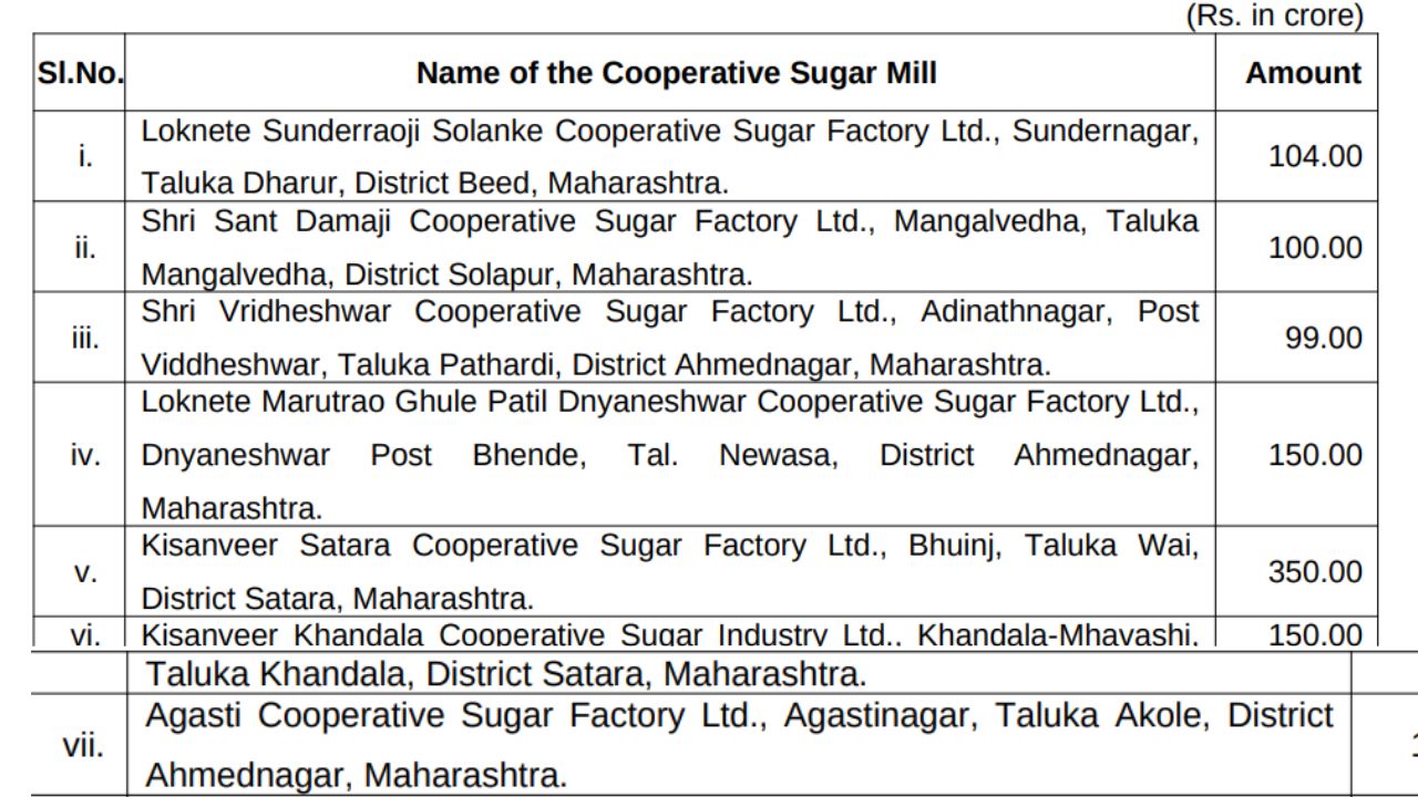 - ५) नागनाथ अण्णा नाईकवाडे यांच्या सांगलीच्या क्रांतिवीर सहकारी साखर कारखाना याला 148 कोटी रुपयांची थकमी देण्यात आलेली आहे. मुख्यमंत्री एकनाथ शिंदे यांचे खासदार धैर्यशील माने यांना लोकसभा निवडणुकीत नागनाथ अण्णा नाईकवाडे यांनी राजकीय मदत केल्यामुळे ही आर्थिक मदतीचा प्रस्ताव मंजूर करण्यात आला आहे. त्यामुळे एकूण 16 सहकारी साखर कारखान्यांना 2265 कोटी रुपयाचा थकहमीचा प्रस्ताव राज्य मंत्रिमंडळाच्या उपसमितीने मंजूर करून राष्ट्रीय सहकारी विकास निगम अर्थात एनसीडीसीकडे पाठविला आहे.
