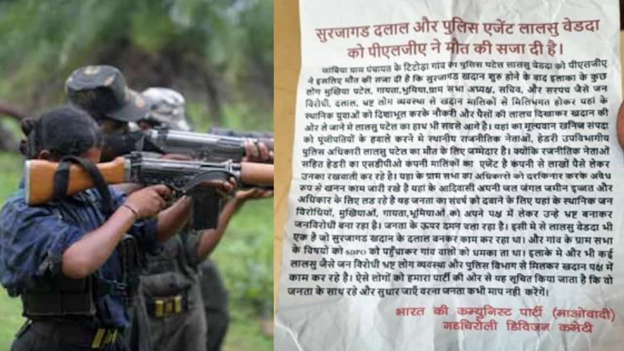 माओवाद्यांच्या गडचिरोली डिविजन कमिटीचं पत्र ‘टीव्ही 9 मराठी’च्या हाती लागलं आहे. हे पत्र दुसऱ्या हत्येनंतरचं आहे. त्यामध्ये त्यांनी आपली भूमिका मांडली आहे. “टिटोडा ग्रामपंचायत पोलीस पाटील लालसू वेडदा पीएलडीएने मृत्यूदंडाची शिक्षा दिली आहे. सुरजागड खदान सुरु झाल्यानंतर पोलीस पाटील, सरपंच, ग्रामसभा अध्यक्ष, सचिव सारखे जनतेच्या विरोधातील लोक, दलाल, भ्रष्ट लोक व्यवस्था आणि खदान मालकांसोबत मिलिभगत करुन इथल्या स्थानिकांची दिशाभूल करत आहेत. ते स्थानिक तरुणांना नोकरीचं आणि पैशांचं आमिष देवून इथली मौल्यवान खनिज संपत्तीचा ऱ्हास करत आहेत”, असं पत्रात म्हटलं आहे.