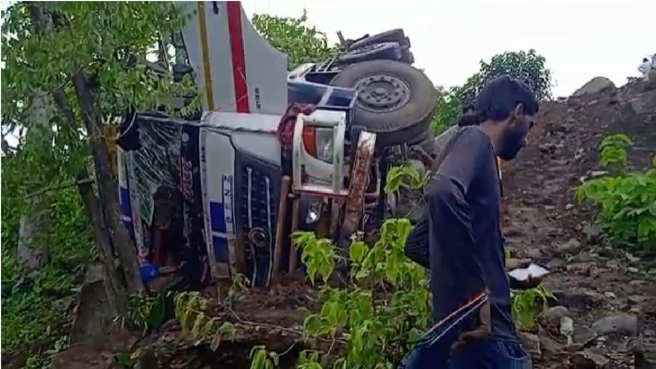 नंदुरबार : नवापूर तालुक्यातील चरणमाळ घाटात सलग दुसऱ्या दिवशी अपघात (Accident) झाल्याची घटना घडलीयं. चरणमाळ घाटात मध्यरात्रीच्या सुमारास कांद्याने भरलेला ट्रक सटाण्याहून गुजरातकडे जात असताना चरणमाळ घाटात अपघात झाला. सुदैवाने या अपघातामध्ये कुठलीही जीवितहानी झाली नसलीतरी चालक आणि सहचालक किरकोळ जखमी झाले आहेत. काल मालेगाव (Injured) सुरत बसचा याचठिकाणी अपघात झाला होता. या अपघातामध्ये वीस प्रवासांना किरकोळ दुखापत झाली होती आणि आज पुन्हा दुसऱ्या दिवशी ट्रक (Truck) घाटात कोसळला आहे. आठवडाभरात हा तिसरा अपघात आहे. मात्र महामार्ग प्रशासन याबाबत कोणतीही ठोस पाऊले उचलतांना दिसत नाहीयं.