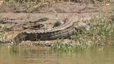 सांगली : सांगलीच्या (Sangli) पलूस तालुक्यातील औदुंबर, भिलवडी, चोपडेवाडी नदीकाठी निसर्गप्रेमींना जवळपास दहा लहान मोठ्या मगरी पहायला मिळाला आहेत. या मगरींचा आकार साधारण सहा फुटांपासून ते तेरा चौदा फुटांपर्यंत असल्याचे देखील सांगण्यात येतंय. यंदा कृष्णा नदीची (Krishna River) पाणीपातळी स्थिर असल्याने मगरींच्या स्थलांतराला मोठा ब्रेक मिळालायं. गेल्या काही वर्षांत 20 जुलै ते 15 ऑगस्ट दरम्यान कृष्णा नदी पात्राबाहेर पुरस्थिती असायची. अशावेळी मगरी (Crocodile) आजूबाजूला चरी, ओढे, वगळी शेतांमध्ये दिसायच्या.
