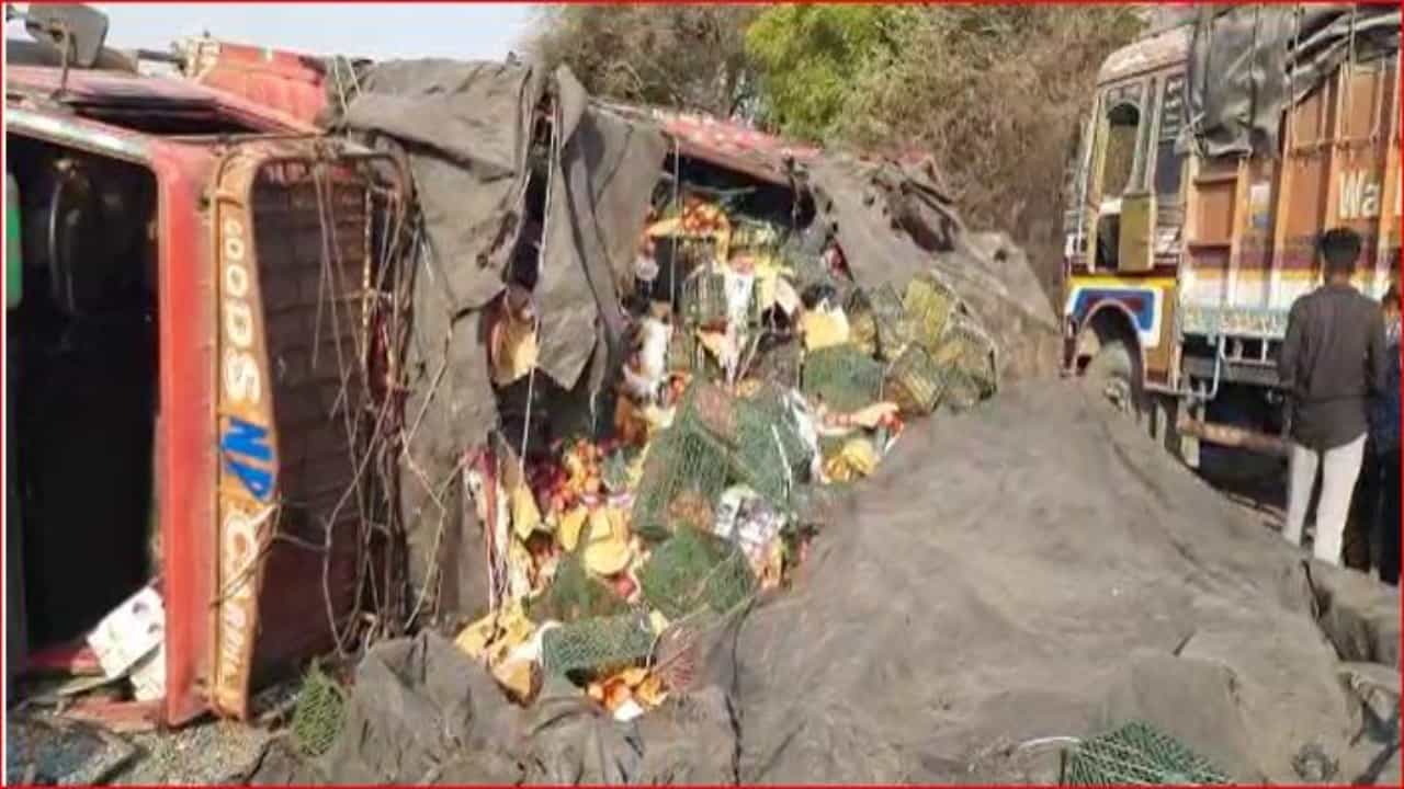 घटनेबाबत अधिक माहिती अशी की, एक ट्रक सफरंच घेऊन मुंबईहून नांदेडकडे जात होता. याच दरम्यान हा ट्रक कल्याण- निर्मळ राष्ट्रीय महामार्गावरील करंजी घाटाजवळ आला असता अचानक पलटी झाला. या ट्रकमध्ये सुमारे नऊ टन सफरचंद होते. ट्रक पलटी झाल्याने सर्व सफरचंद रस्त्यावर पडले. हे सफरचंद गोळा करण्यासाठी नागरिकांनी गर्दी केली. मात्र अपघाताची माहिती मिळतचा पोलिसांनी घटनास्थळी धाव घेतली आणि मदत कार्याला सुरुवात केली. पोलिसांनी नागरिकांना सफरचंद घरी घेऊन जाण्यास मज्जाव केला. या अपघातातमध्ये सुदैवाने कोणतीही जीवितहानी झाली नसल्याची माहिती पोलिसांनी दिली.