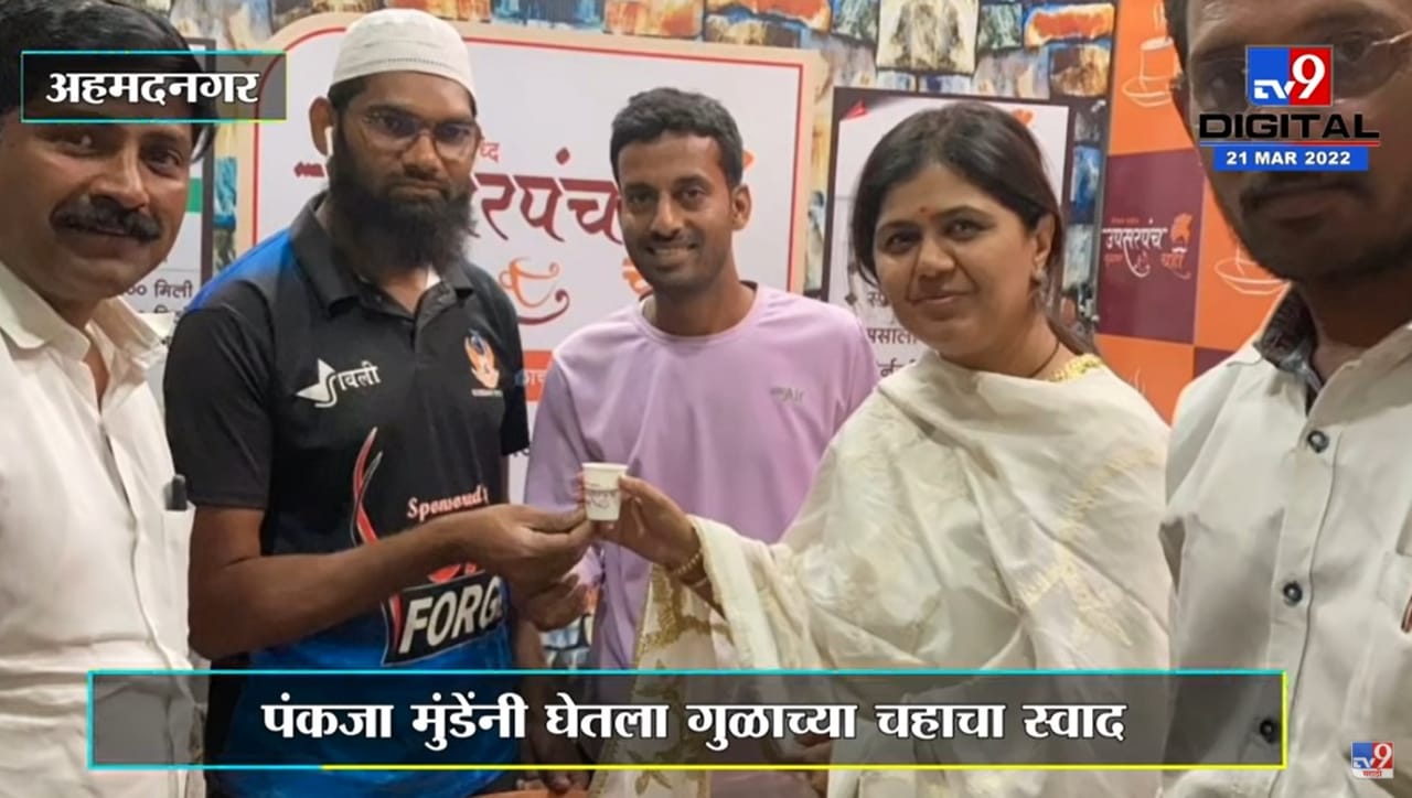 अहमदनगरला (Ahmednagar) शेवगाव येथे माजी मंत्री पंकजा मुंडे (Pankaja Munde) रात्री उशिरा चहा (Tea) पिण्याचा आनंद घेतलाय. आष्टीहून औरंगाबाद येथे जात असतांना शेवगाव येथे कार्यकर्त्यांसोबत चहा पीत त्यांची विचारपूस केलीये. शहरातील एका दुकानात साधेपणाने चहा घेतल्याचा त्यांचा हा व्हिडिओ सोशल मीडियावर व्हायरल झाला असून त्यांच्या साधेपणाची चर्चा सुरू आहेय. औरंगाबाद येथे जात असताना रात्री 11च्या दरम्यान कार्यकर्त्यांच्या आग्रहास्तव शेवगाव येथे त्या थांबल्या होत्या. यावेळी शहरातील क्रांती चौकातील अमजद पठाण यांच्या हॉटेलमध्ये त्यांनी गुळाचा चहा घेतला. यावेळी भाजपाचे कार्यकर्ते आणि पदाधिकारी उपस्थित होते. दरम्यान, आपण तुमच्यासाठीच थांबलो असल्याचे दुकानदार अमजद पठाण यांनी पंकजा मुंडे यांना गंमतीत सांगितले. तर गाडीत गरम चहा लागतो, असे पंकजा मुंडे आपल्या कार्यकर्त्यांना म्हणताना व्हिडिओमध्ये दिसते.